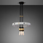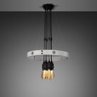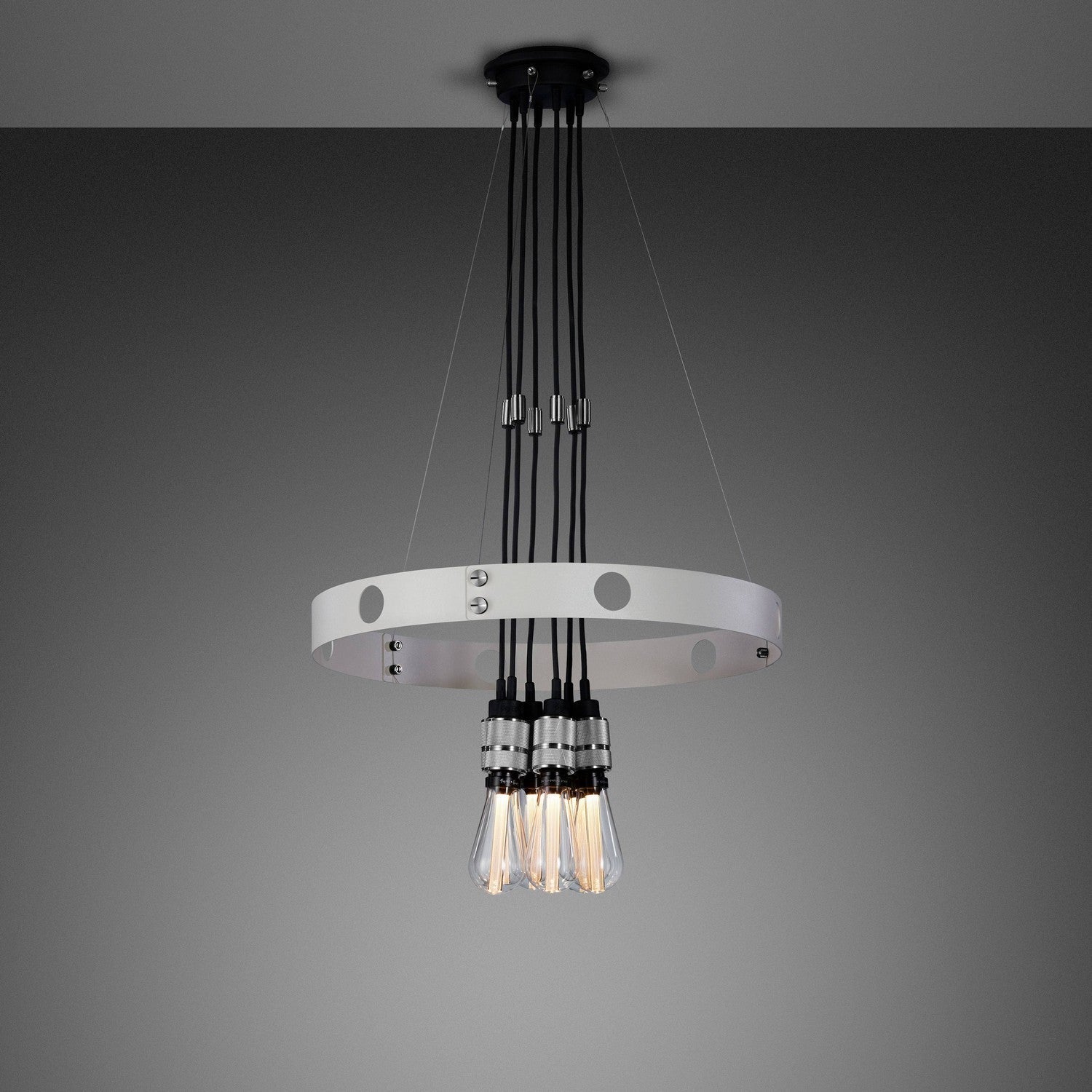 A chandelier finished in a stone powder coat and features six pendants, with solid knurled metal and matt rubber detailing.
