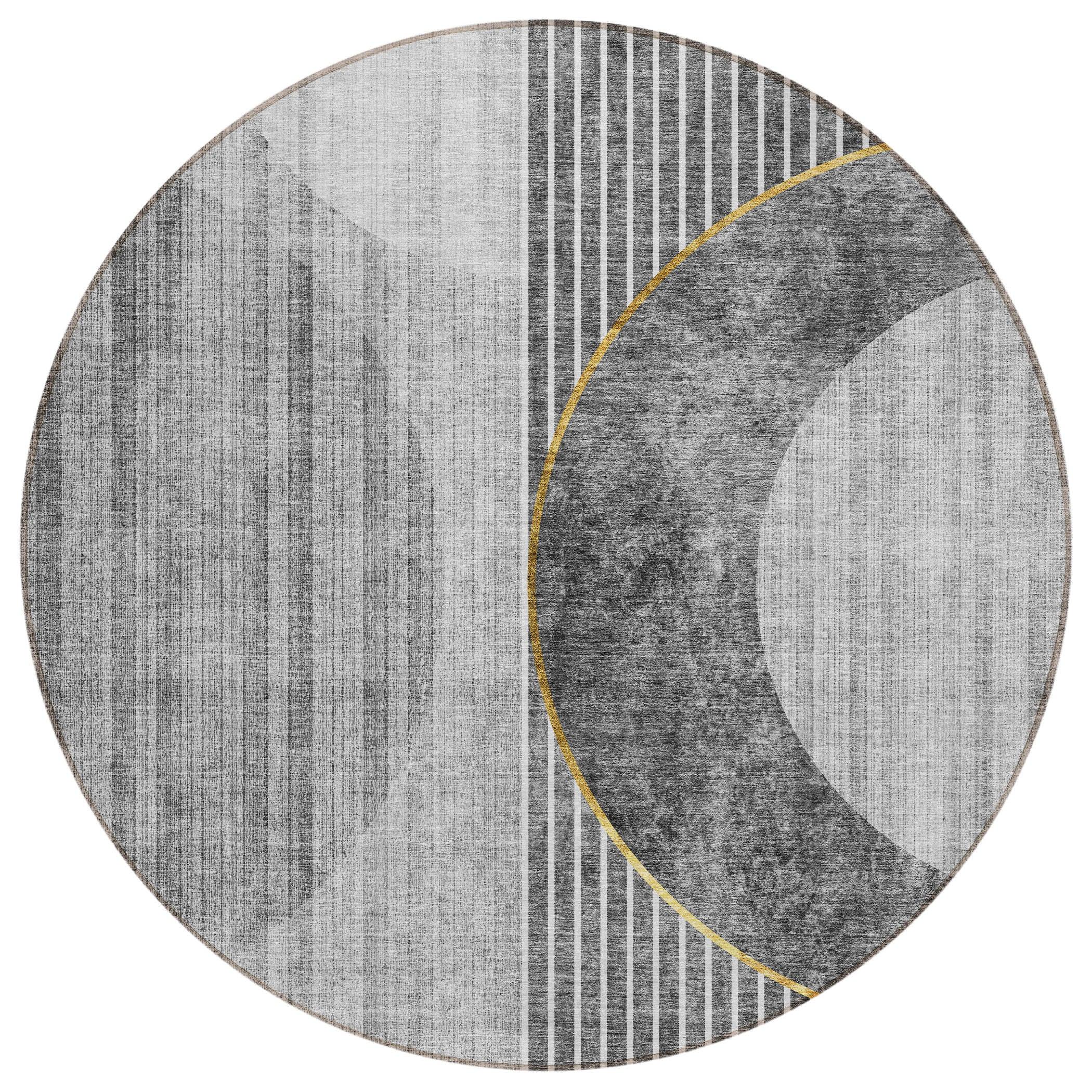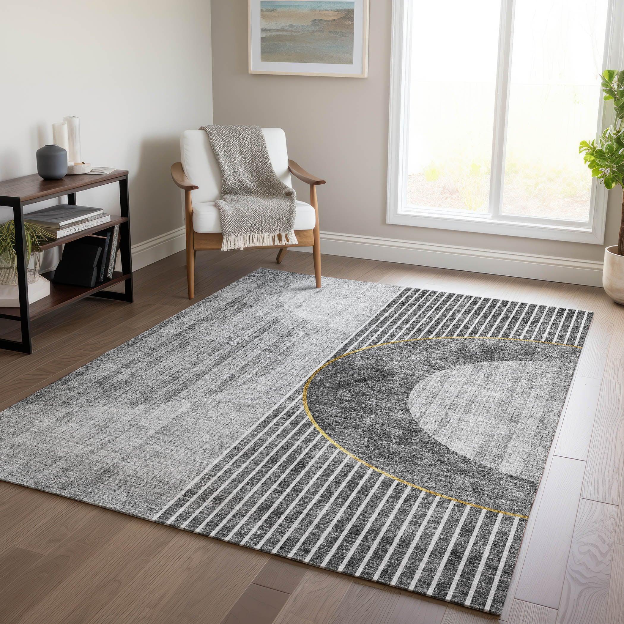 Chantille ACN676 Charcoal, a stylish and versatile area rug that effortlessly elevates your modern decor. The design showcases linear charm with semi circles at its center, offering a contemporary twist on transitional aesthetics. Perfect for both indoor and outdoor spaces, this rug is UV-stabilized for long-lasting use. Its ultra-thin construction includes a non-skid backing, eliminating the need for an additional rug pad. Easy to maintain, this rug is machine-washable, making it a practical choice for busy families and pet owners seeking both functionality and elegance. Experience the perfect blend of style and convenience with the Chantille ACN676 Charcoal area rug.