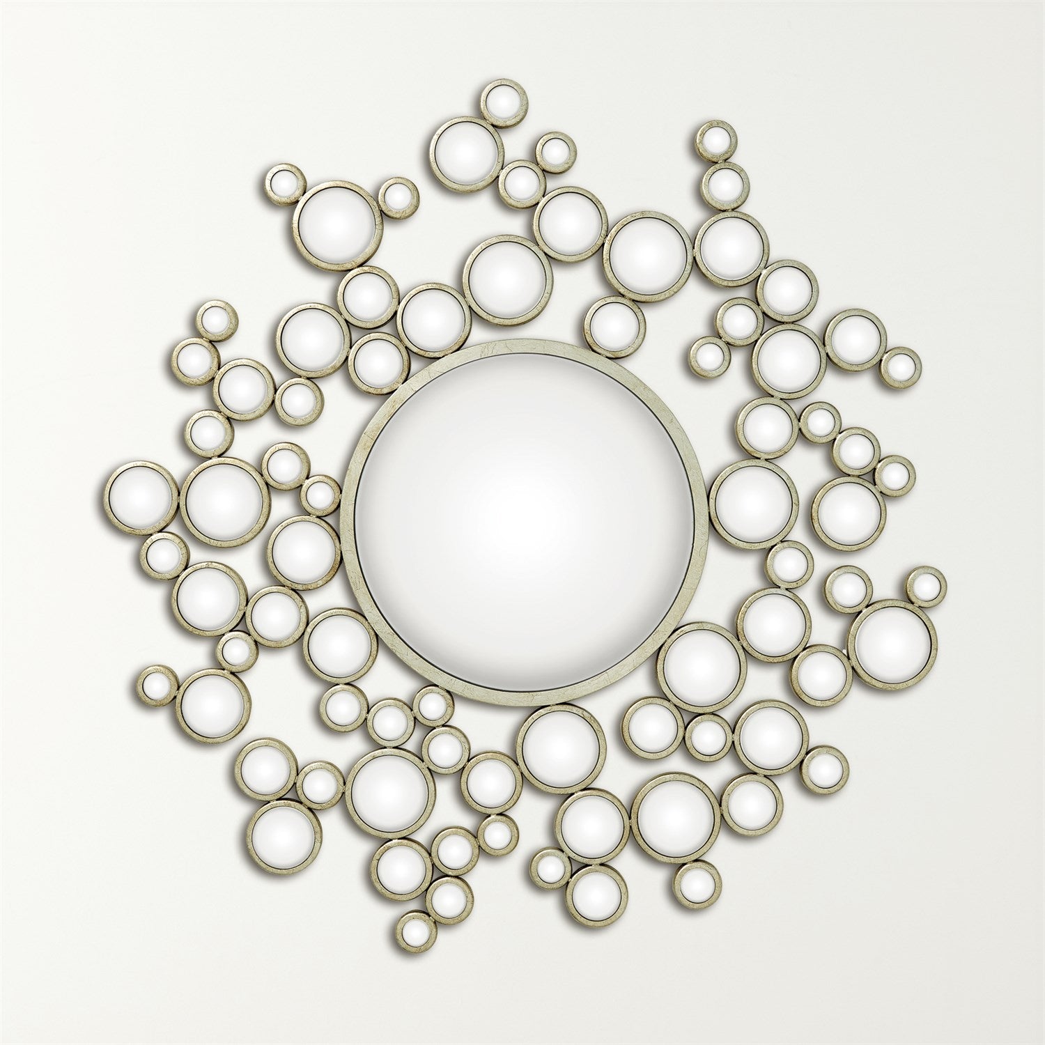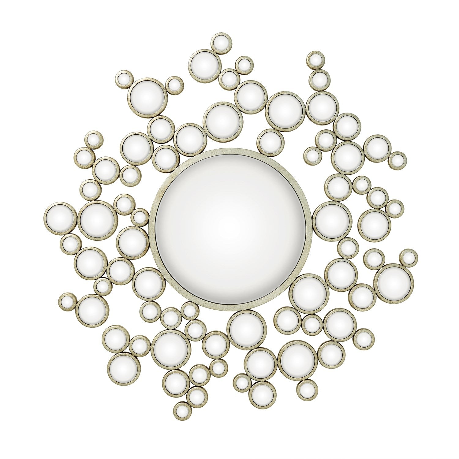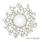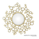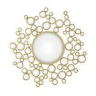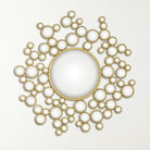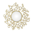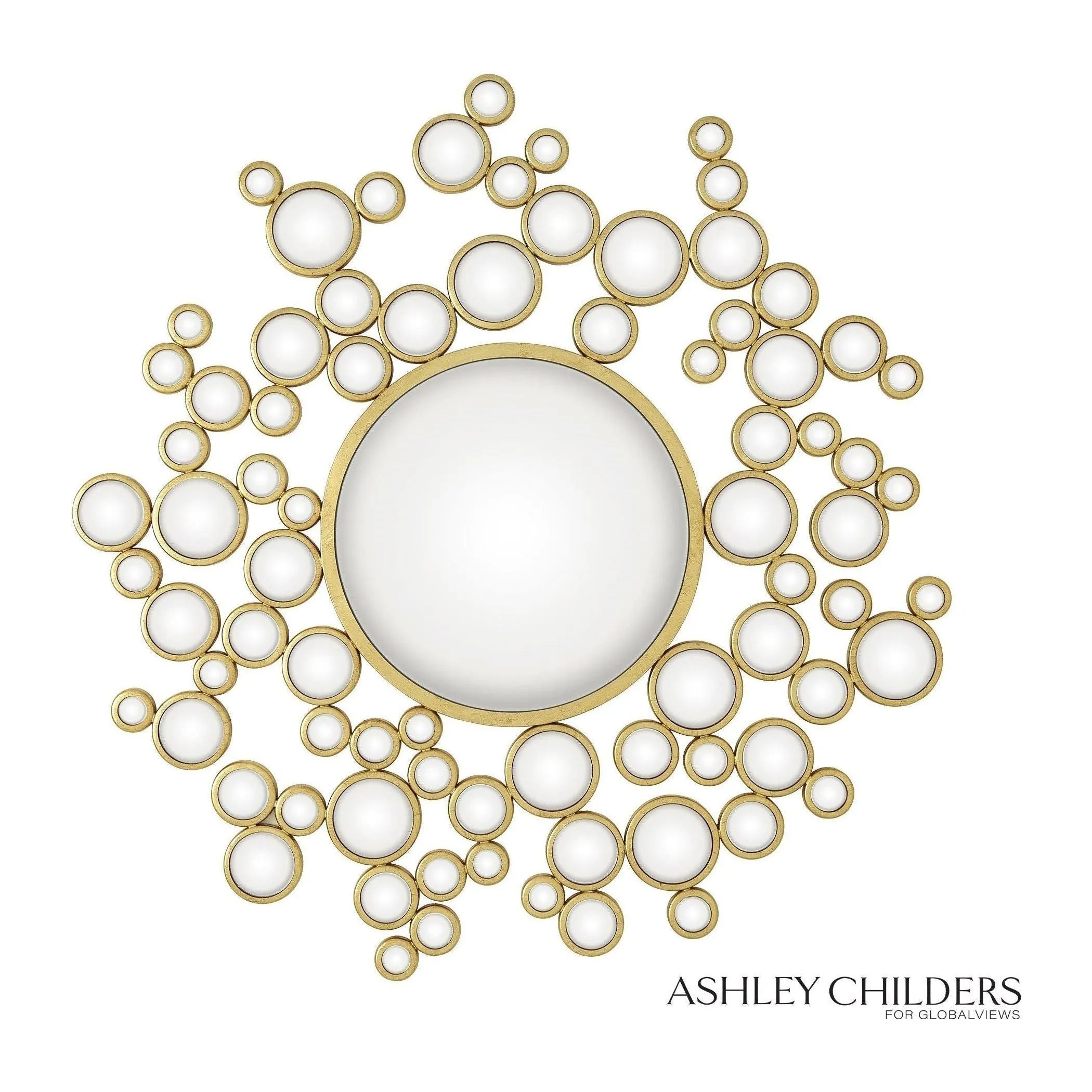 Aquarius Mirror — a sculptural focal piece that balances playful geometry with refined finish. Designed by Global Views, this eccentric round mirror layers a central glass disk with a constellation of smaller circular mirrors framed in warm gold leaf for an immediate luxury décor impact.