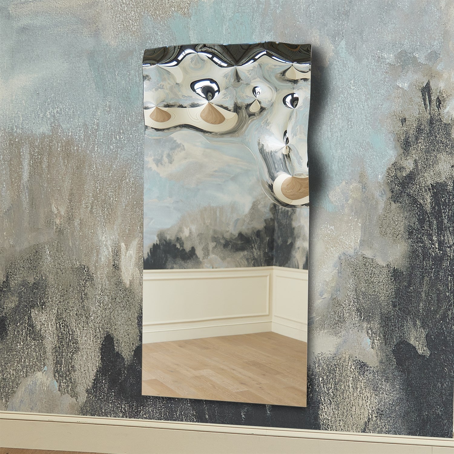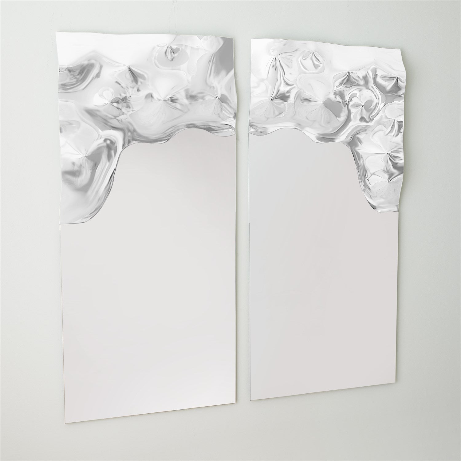 The Asymmetrical Ripple Mirrors are stunning, hand-formed works of art crafted from Italian glass. A meticulous artisan technique melts a thick piece of glass over a sculpted form, creating organic etchings that accentuate the design’s fluid curves and dynamic movement. Whether displayed individually or grouped together, these mirrors make a bold, sculptural statement on any wall.