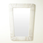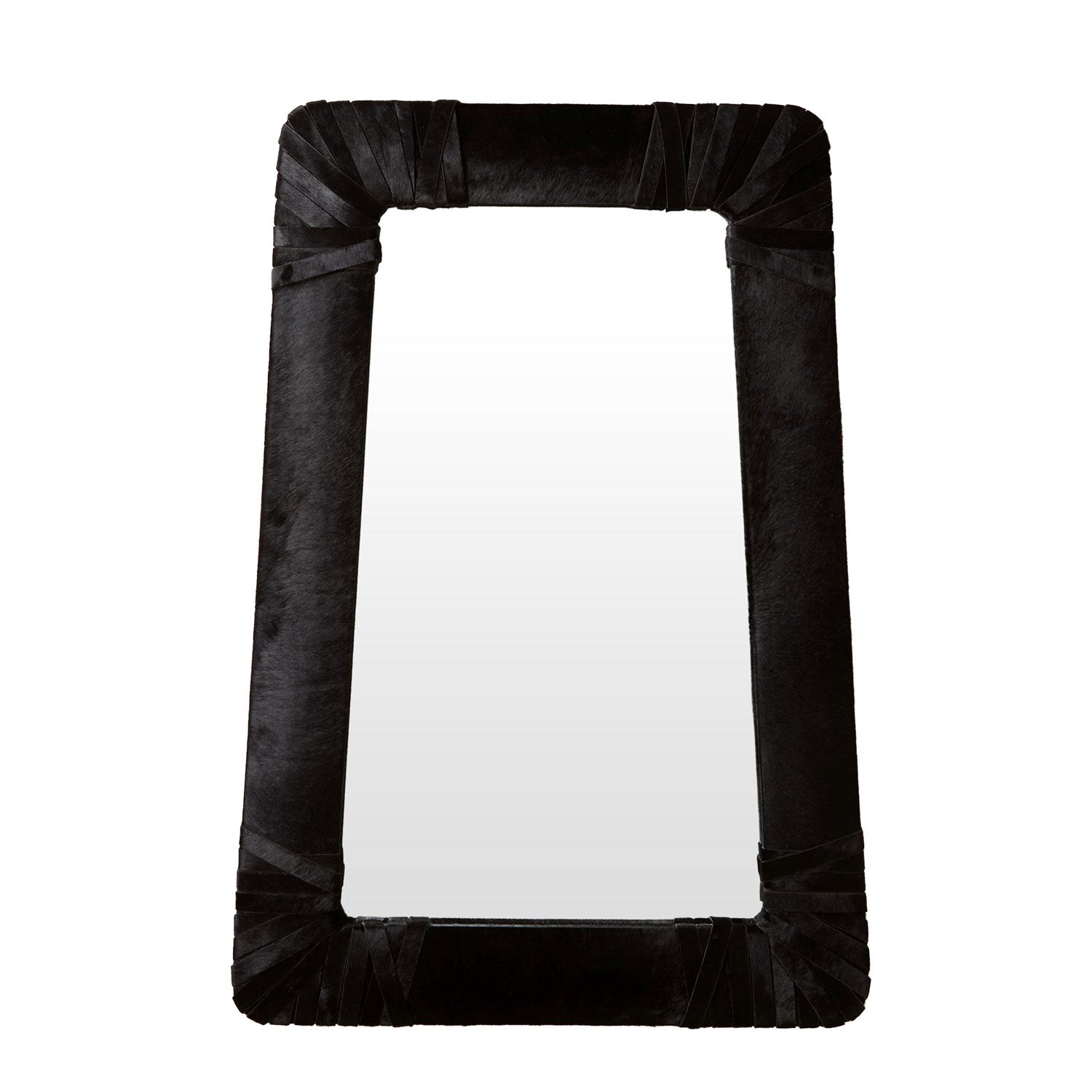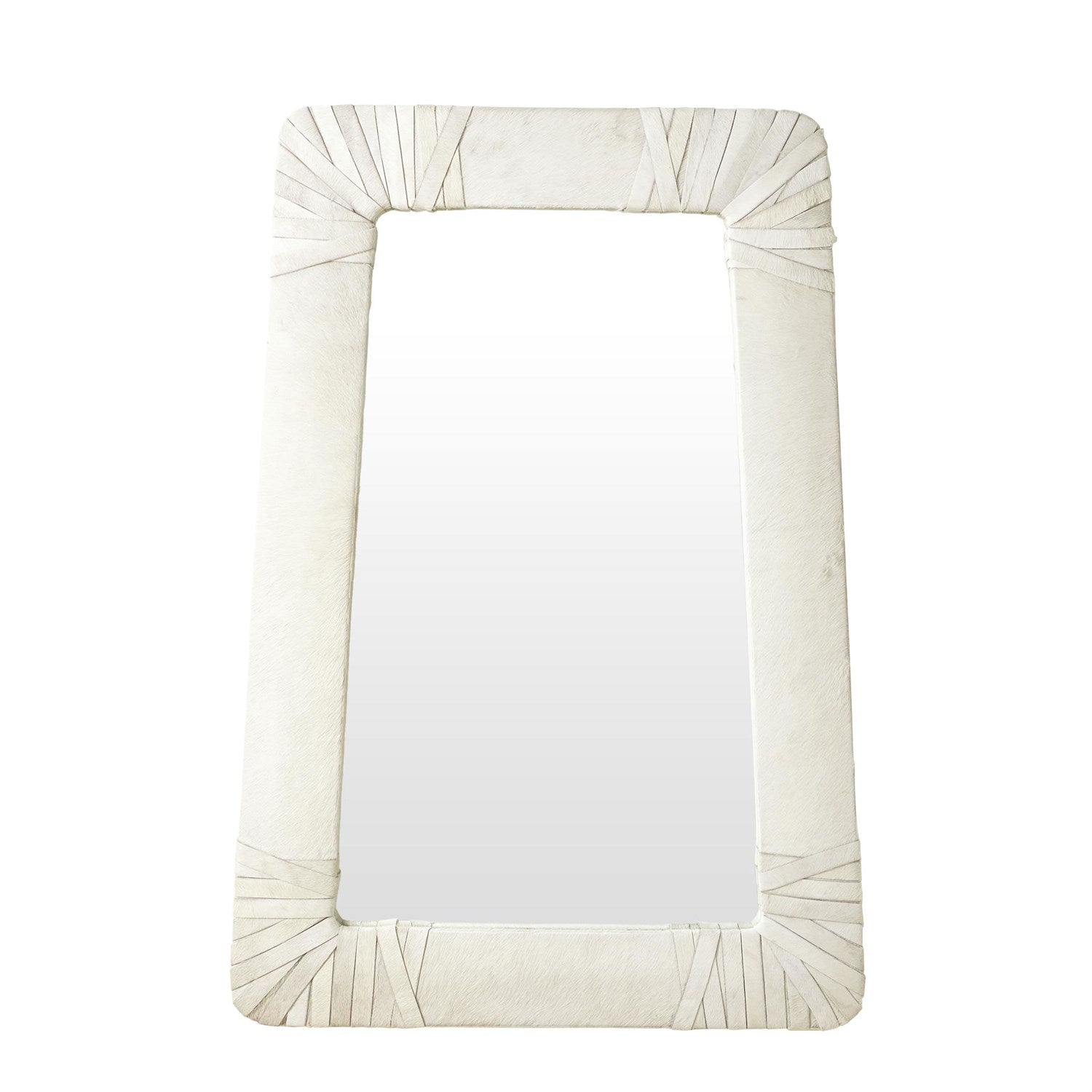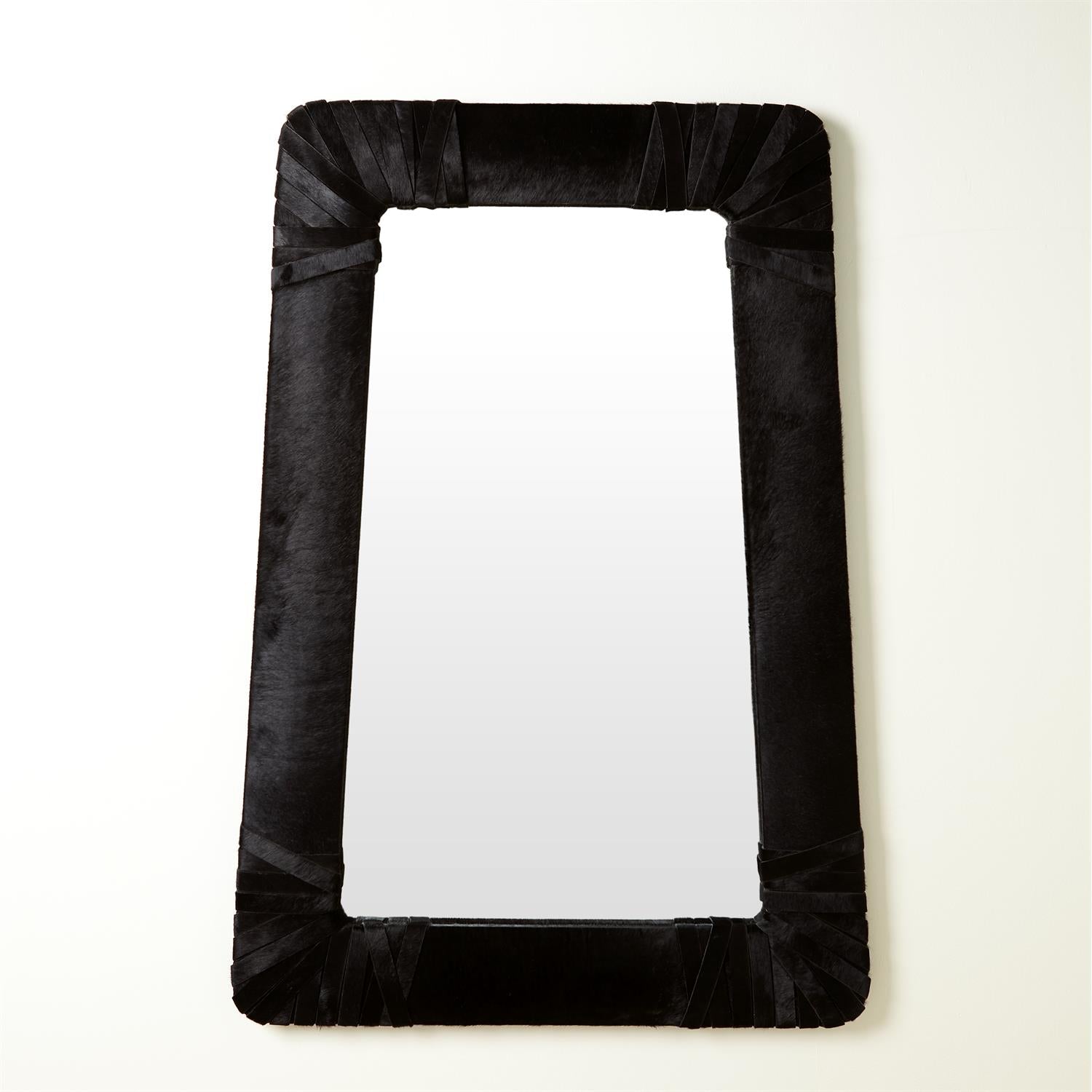 This wonderfully proportioned mirror is upholstered in a luxurious hair-on-hide with hair-on-hide wrapped corners. The tapered shape of the Gabriel mirror can be hung with either the wide or the narrow end at the top. Available in white and black hair-on-hide.