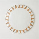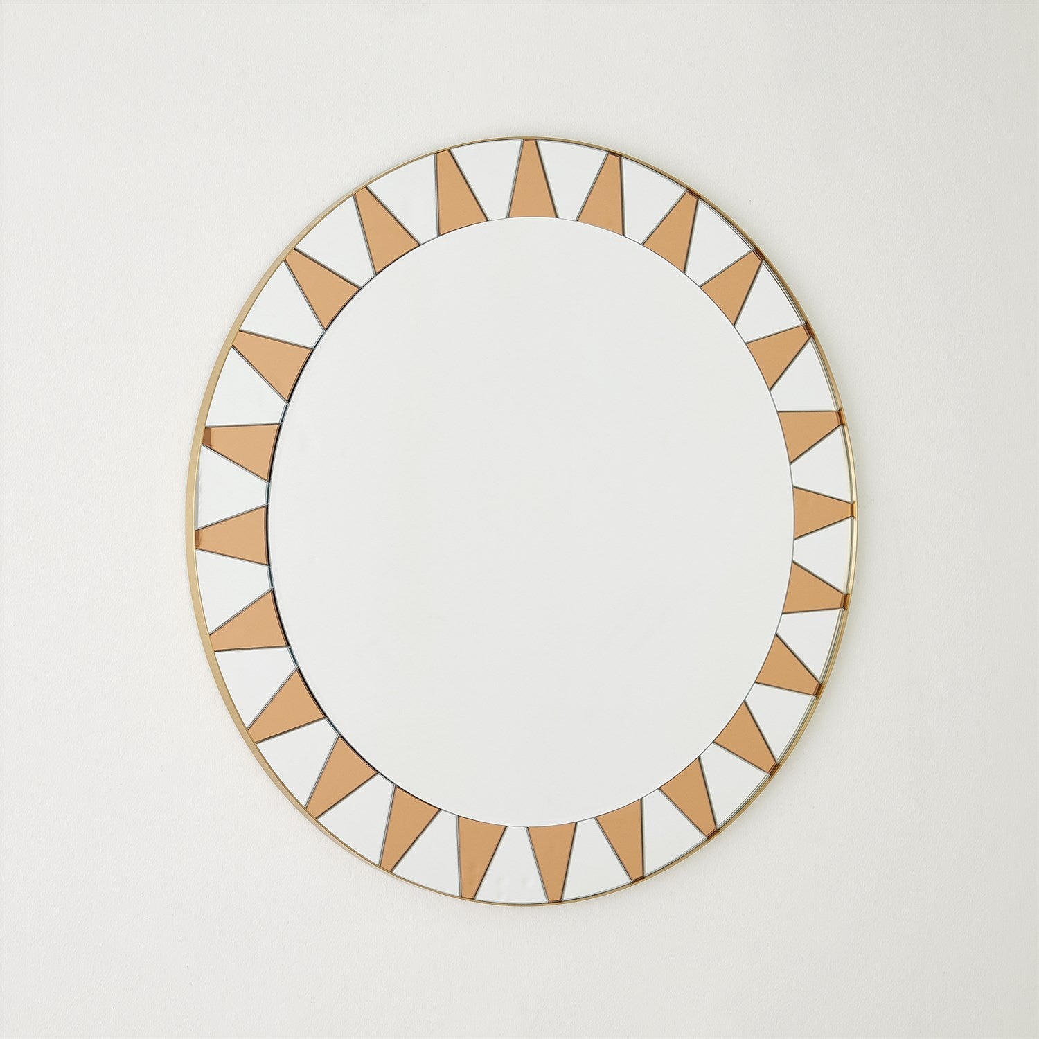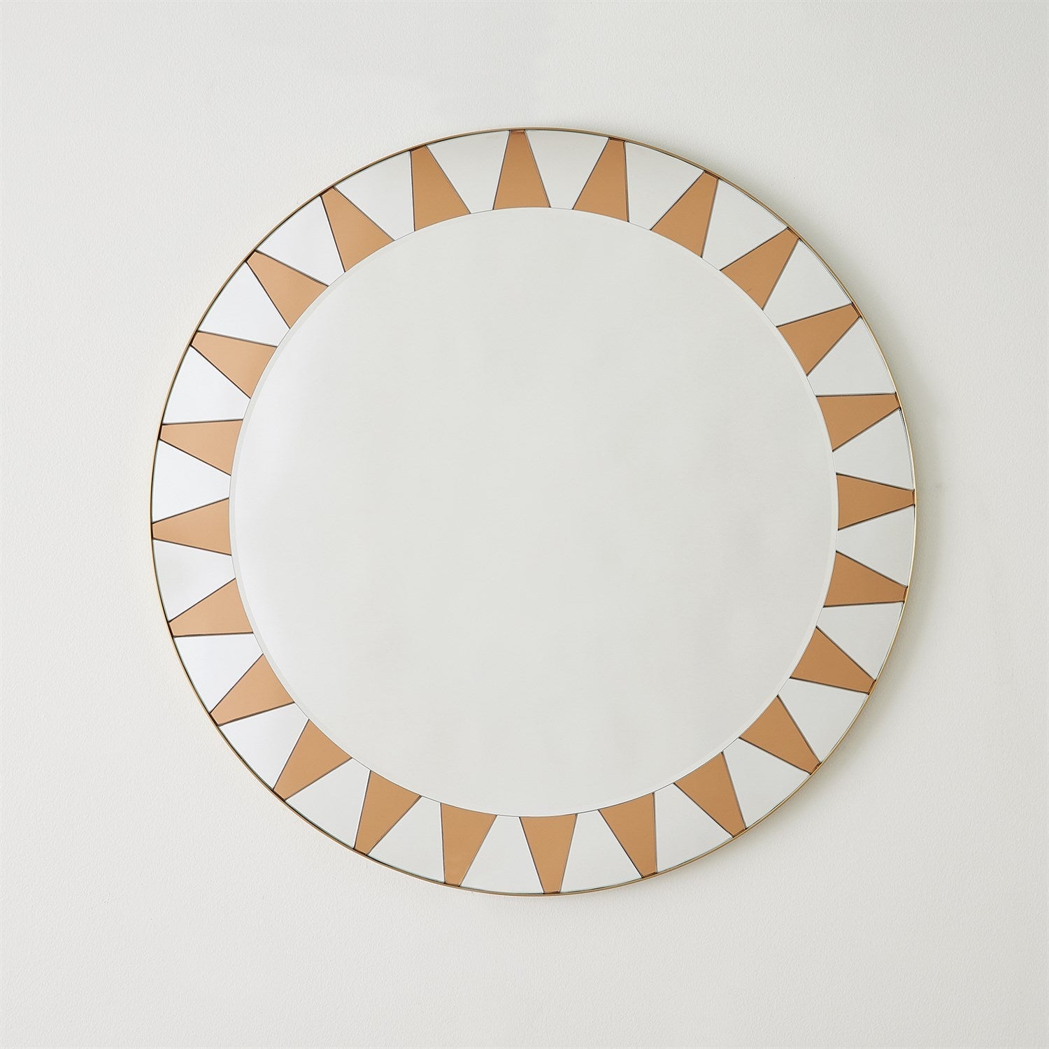 The Round Sun Mirror captivates with a beveled central mirror encircled by alternating clear and amber triangular glass pieces, creating a stunning sunburst motif. A dynamic interplay of color and geometry lends this design its radiant presence.
