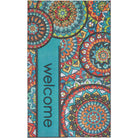 Bohemian Kingdom Multi doormat, featuring mosaic pinwheel medallions in a vibrant palette of red, blue, orange, aqua, teal, green, white, black, and yellow. This globally inspired design from Mohawk Home's Doorscapes Collection adds a colorful touch to your entryway. Crafted with 100% recycled rubber backing, this doormat is not only stylish but also environmentally friendly.