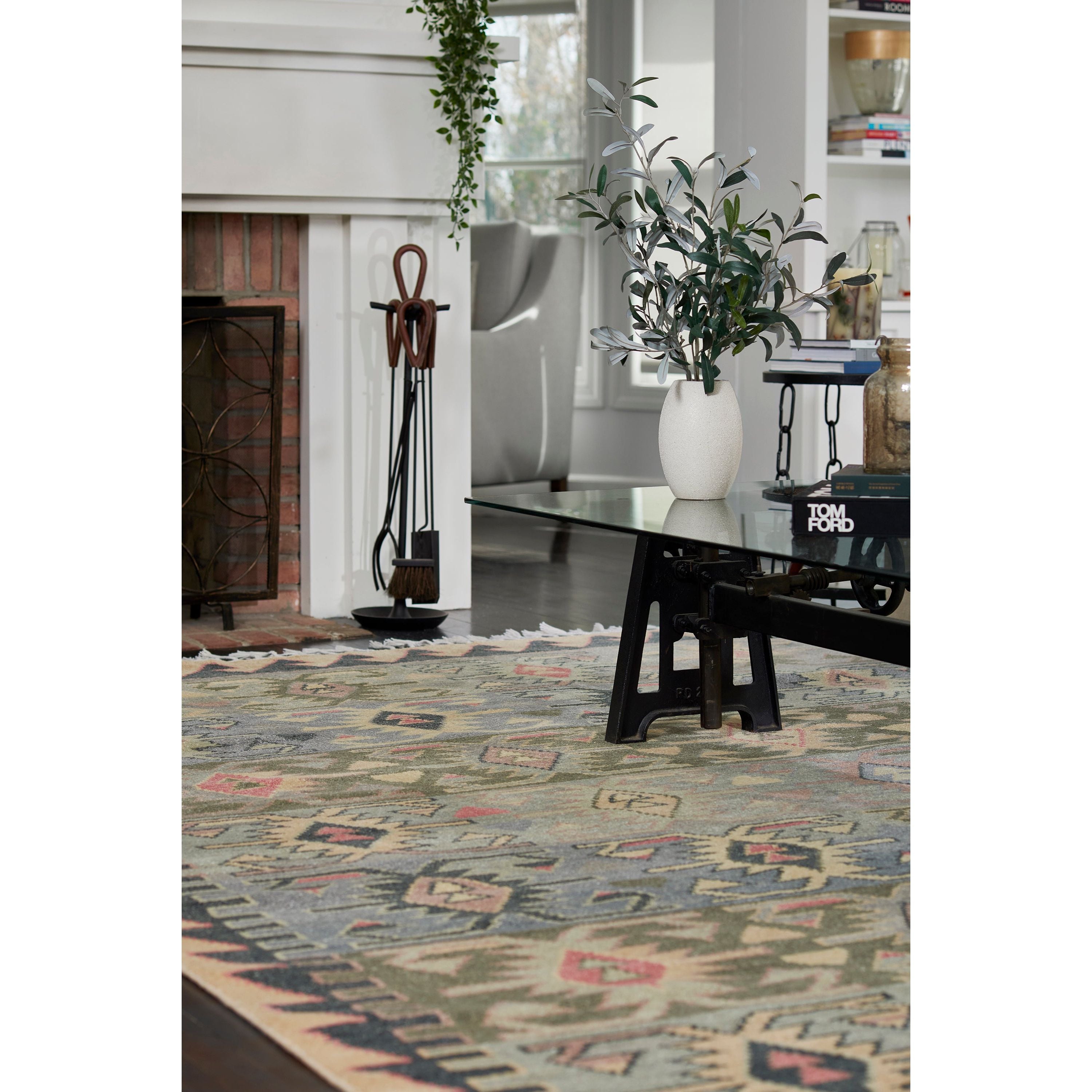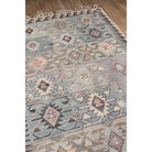 Nomad Nom 1 Blue, a stylish rug that embodies the boho chic aesthetic with its tribal design. The rug draws inspiration from traditional area rug motifs, featuring classic diamond and dot symbols in a vibrant color palette. Its ornamental field and decorative border showcase a repeating geometric pattern that adds a touch of global flair to any space. To enhance its free-spirited appeal, each rug is adorned with tassels of fringe for an extra touch of texture.