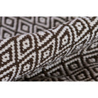 River Riv 4 Brown area rug, a fusion of traditional aesthetics with a modern twist. The tribal design features an elongated diamond trellis pattern, adorned with bold stripes in black, blue, yellow, and orange hues. Crafted from durable synthetic fibers, this hand-woven rug is perfect for high-traffic areas in your home.