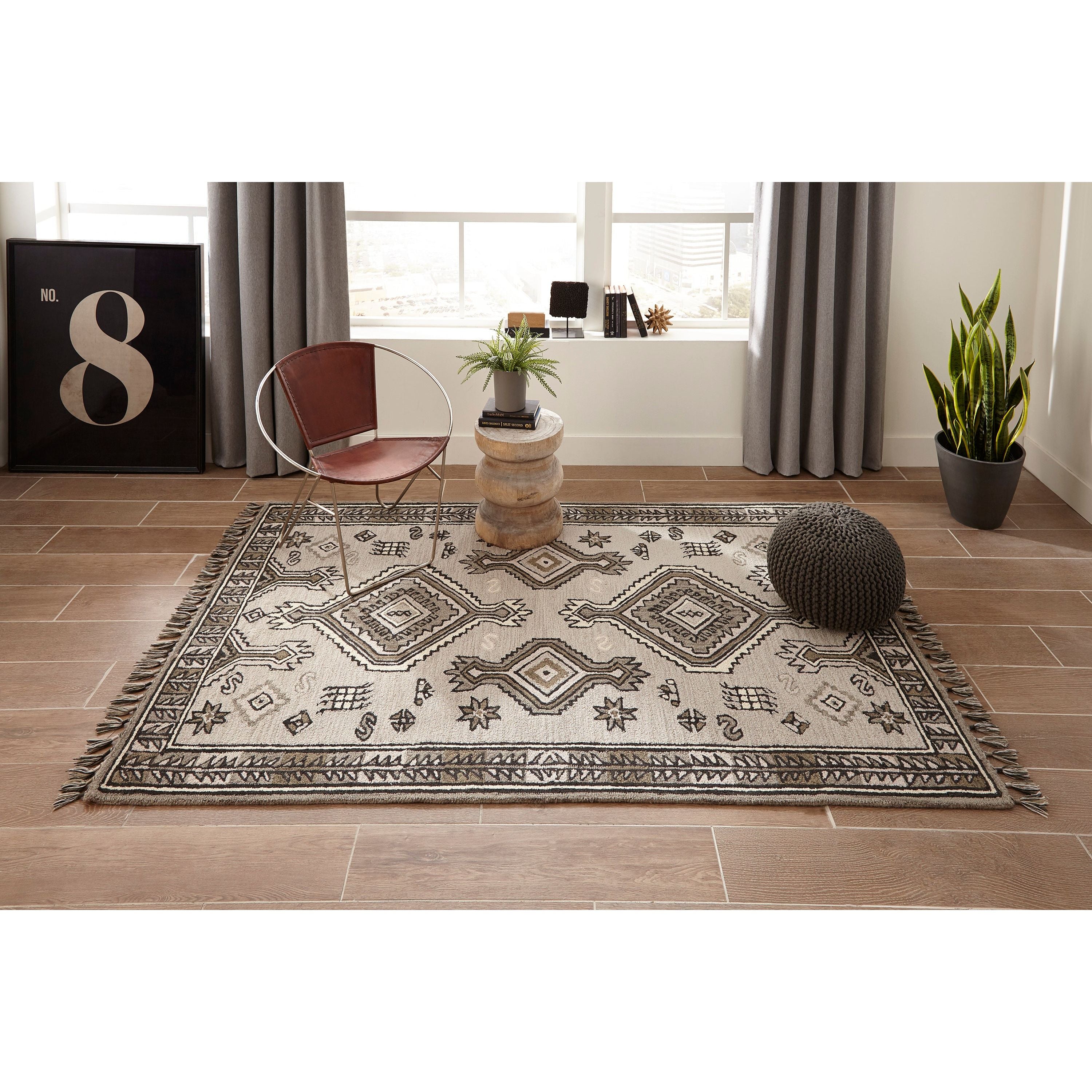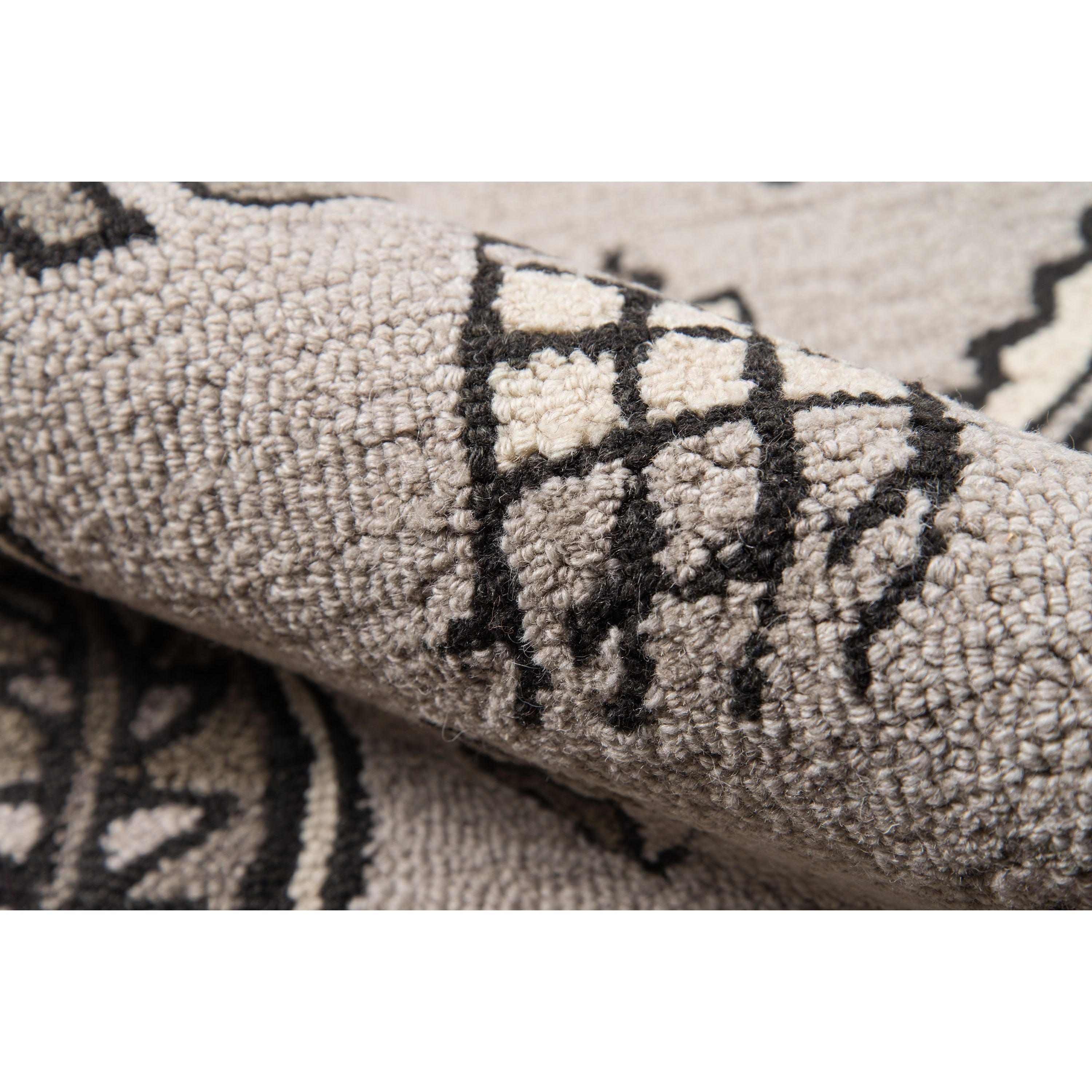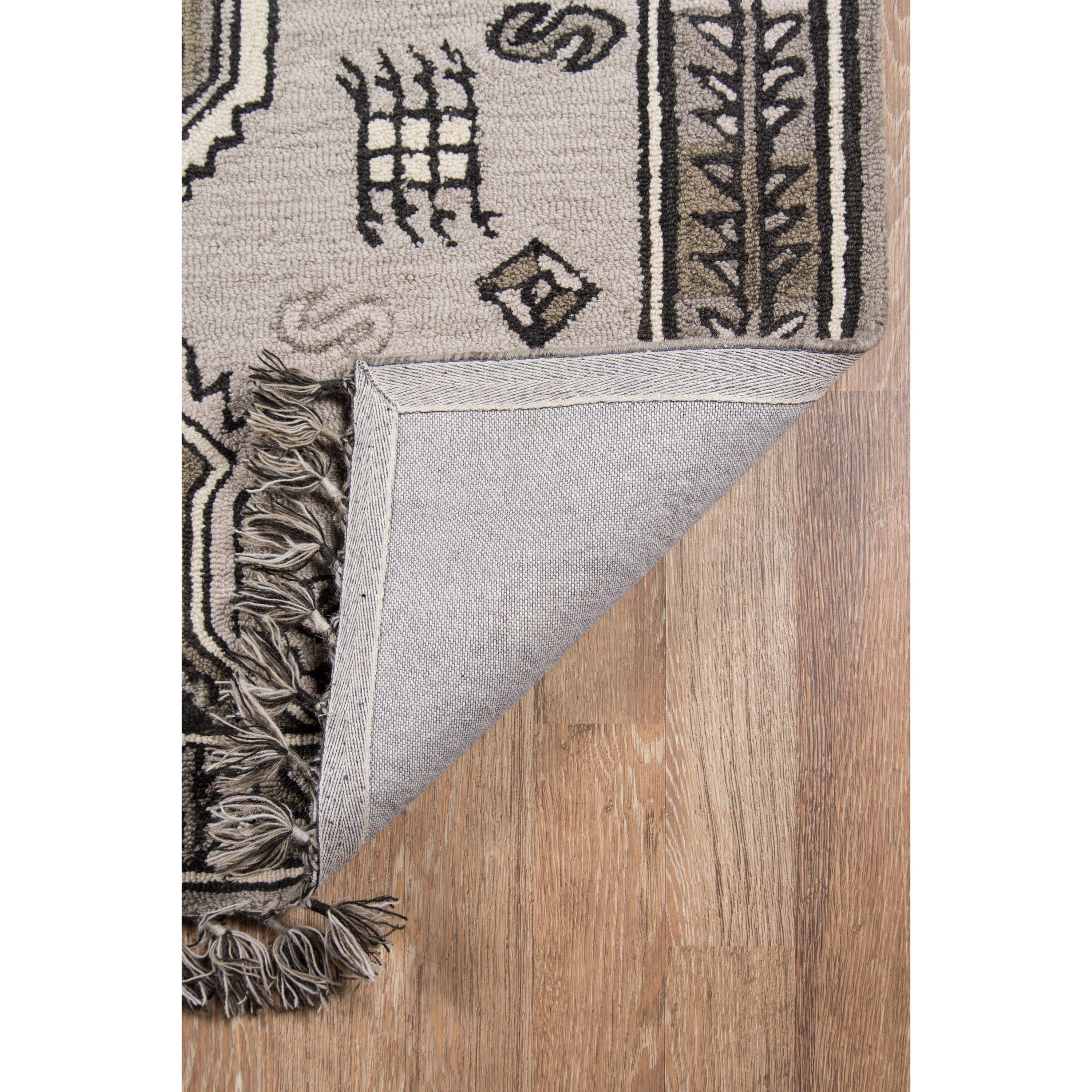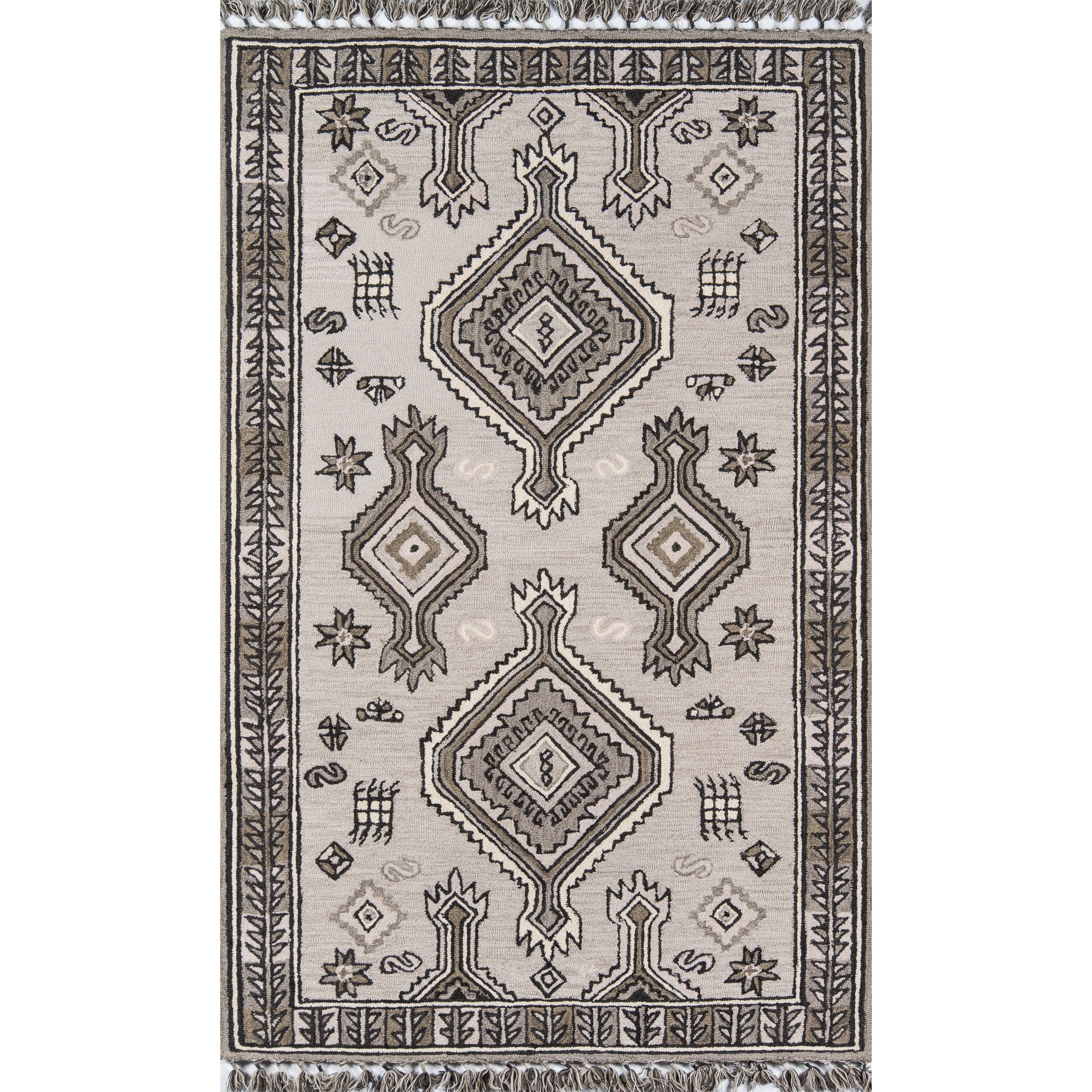 Tahoe Ta 03 Grey area rug, a fusion of Southwestern motifs with a contemporary twist. This decorative rug showcases a range of tribal patterns, each displaying a geometric repeat inspired by traditional tribal designs. The intricate linework features diamonds, crosses, medallions, and stars forming striking stripes across the rug. Adding to its exotic appeal are tassels at the top and bottom that emphasize the playful fringed border. Crafted from natural wool threads through hand hooking techniques, this rug stands out for its exceptional style and composition.