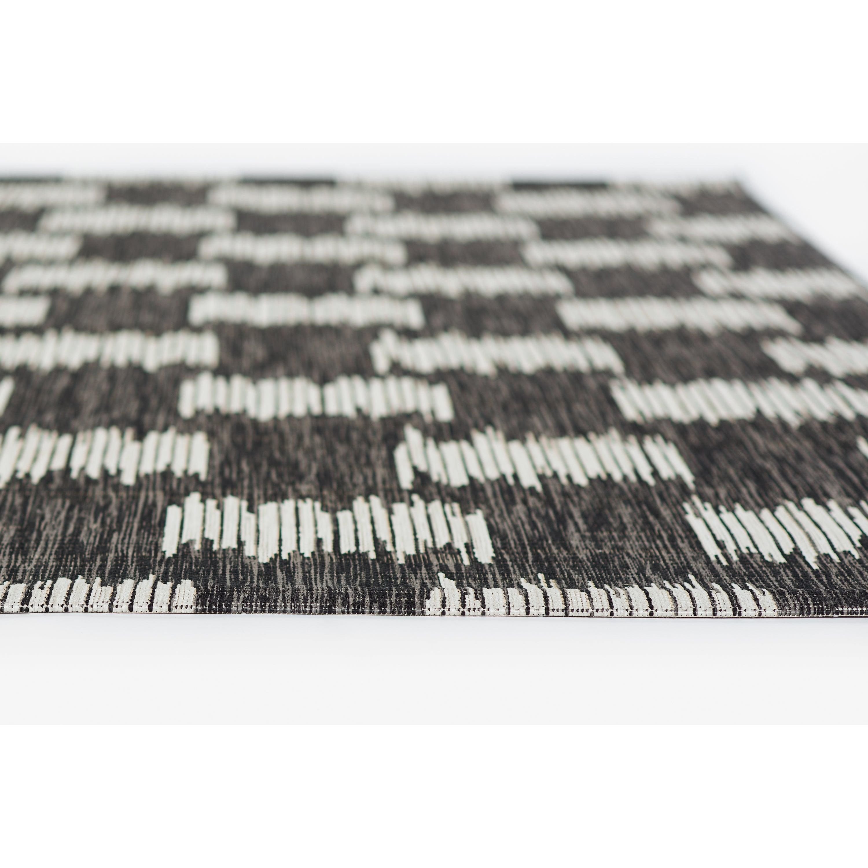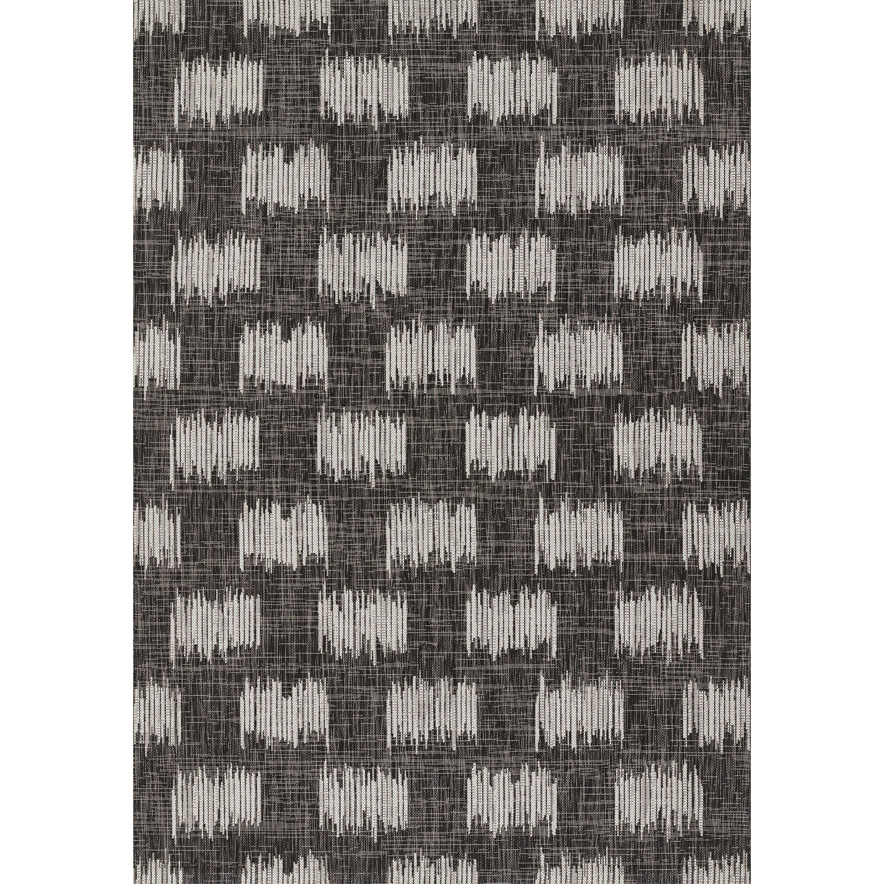 Villa Vi 12 Charcoal, a versatile indoor/outdoor rug collection that effortlessly combines contemporary style with durability. This modern area rug assortment showcases repetitive patterns influenced by global architectural designs, perfect for adding a touch of modern flair to any space. The all-weather rug series stands out with its striking graphic geometric prints in charcoal grey, chambray blue, fuchsia pink, and russet red hues, creating a bold statement on your floor.
