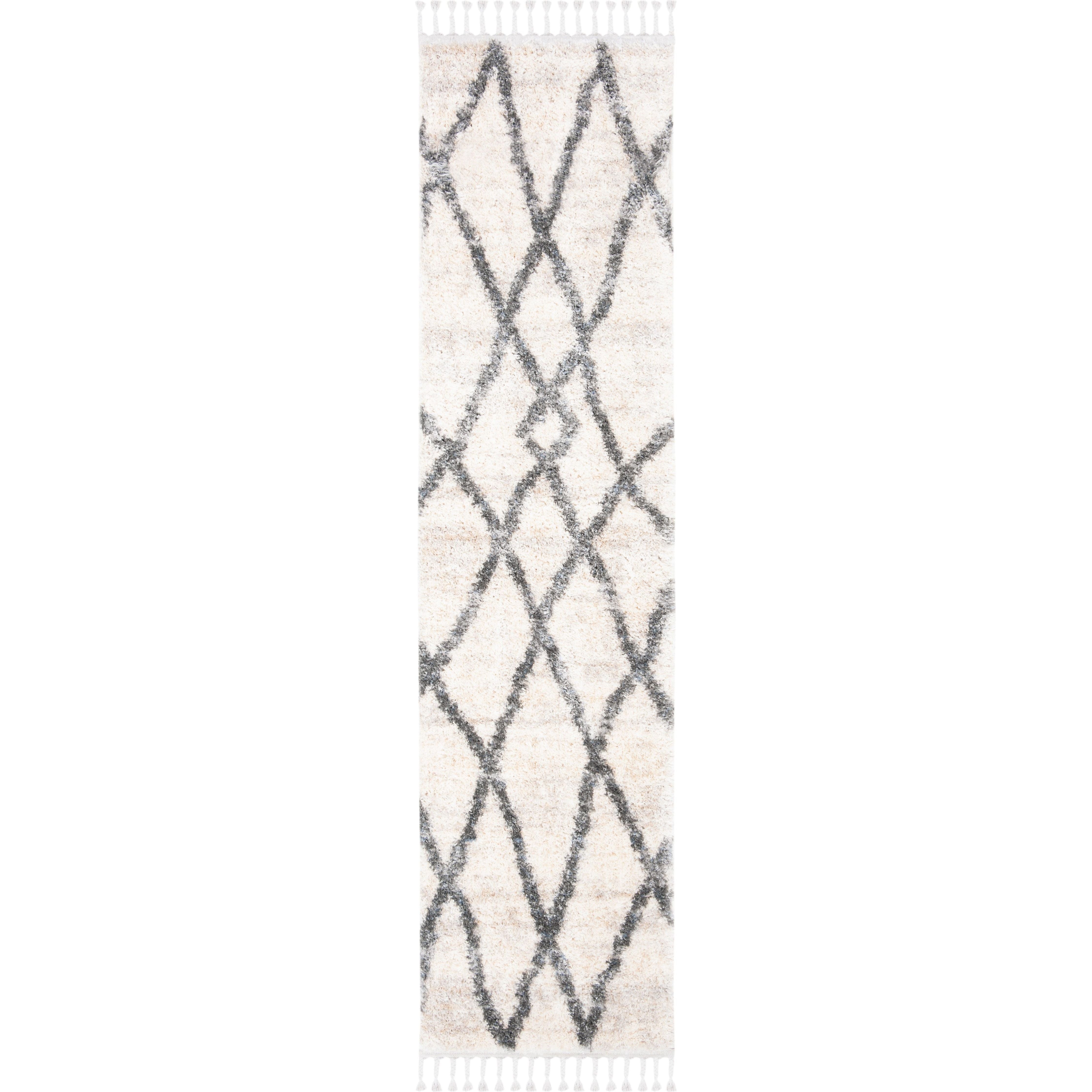 Berber Fringe Shag BFG628B in Creme Black, a stunning rug inspired by the intricate designs of Morocco. This modern twist on traditional aesthetics features distinctive fringe detailing and a classic trellis pattern, all crafted with easy-care fibers to minimize shedding. With an approximate thickness of 1.2 inches, this rug adds both style and comfort to any space.