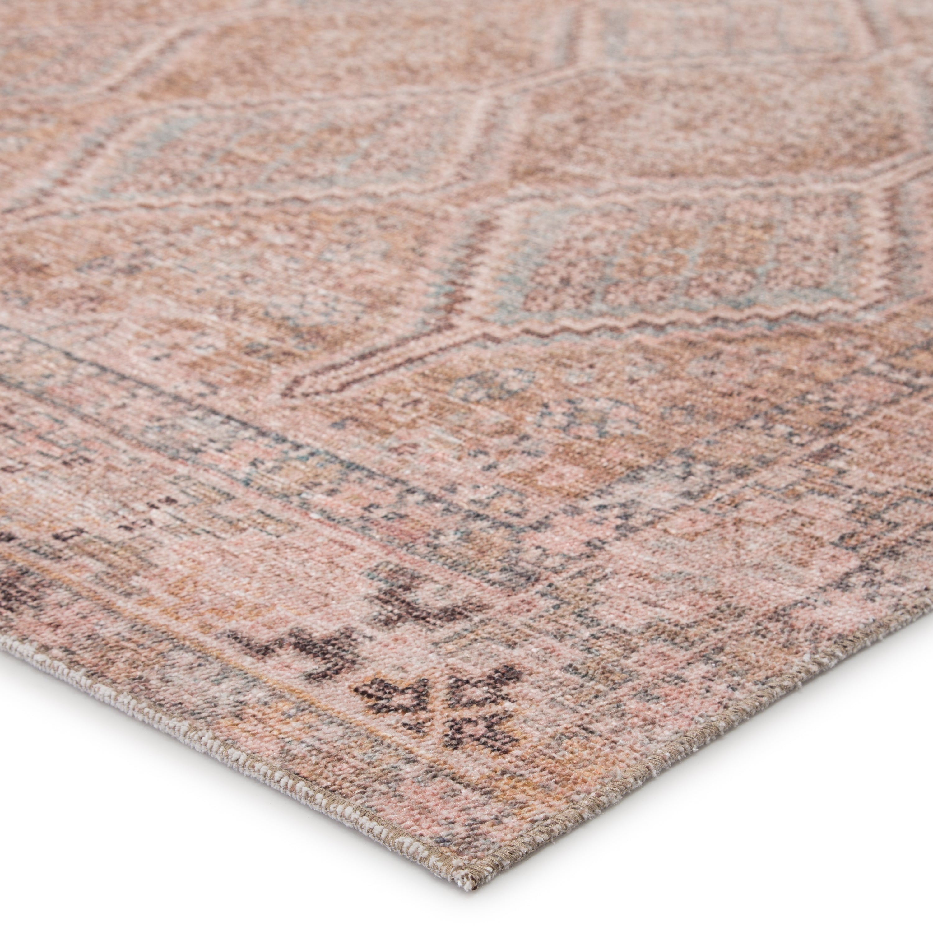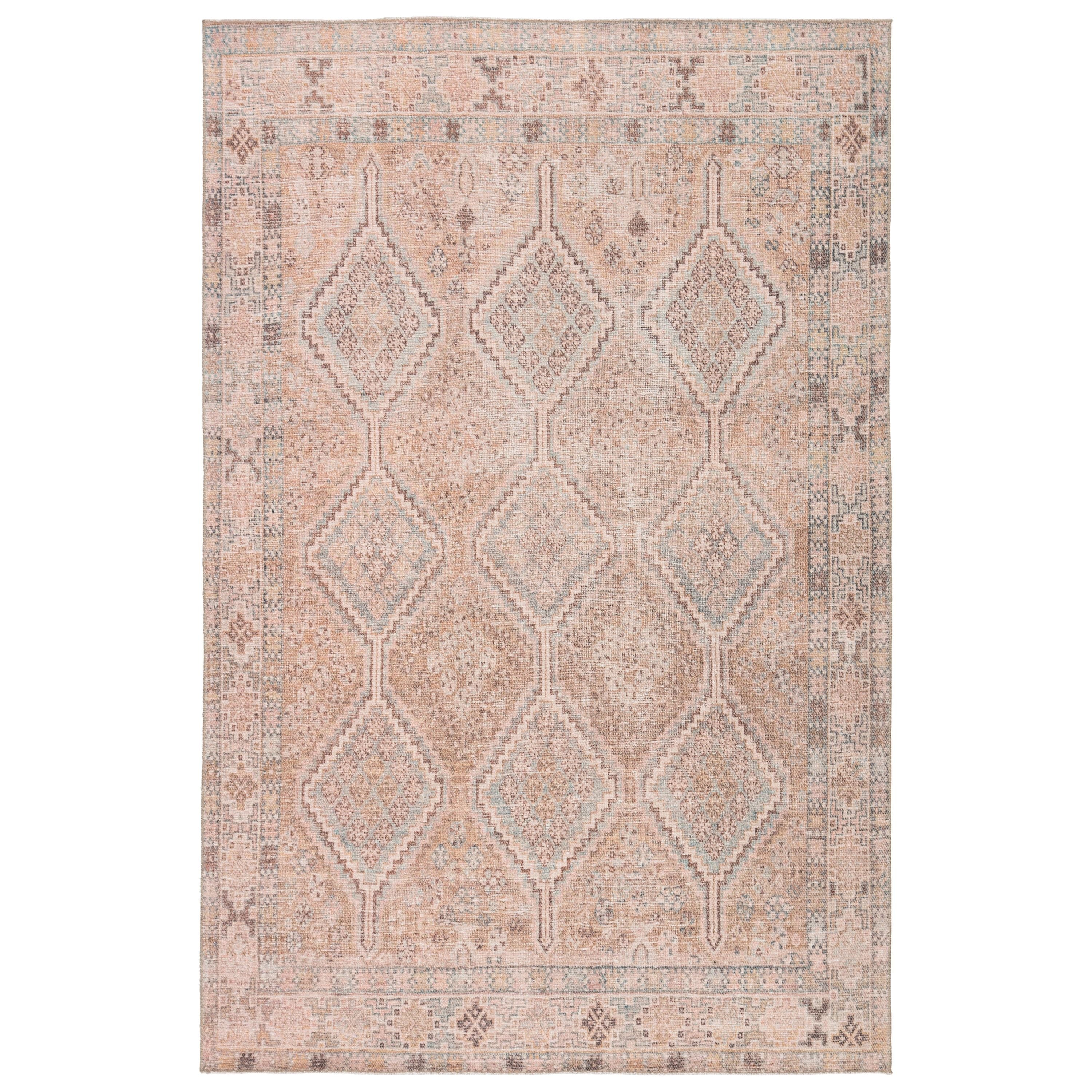 The Kindred collection melds the timelessness of vintage designs with modern, livable style. The Marquesa area rug boasts an elegantly distressed Turkish diamond pattern in contemporary tones of light pink, blue, gold, and brown. This low-pile rug is made of soft polyester and features a one-of-a-kind antique rug digitally printed design.