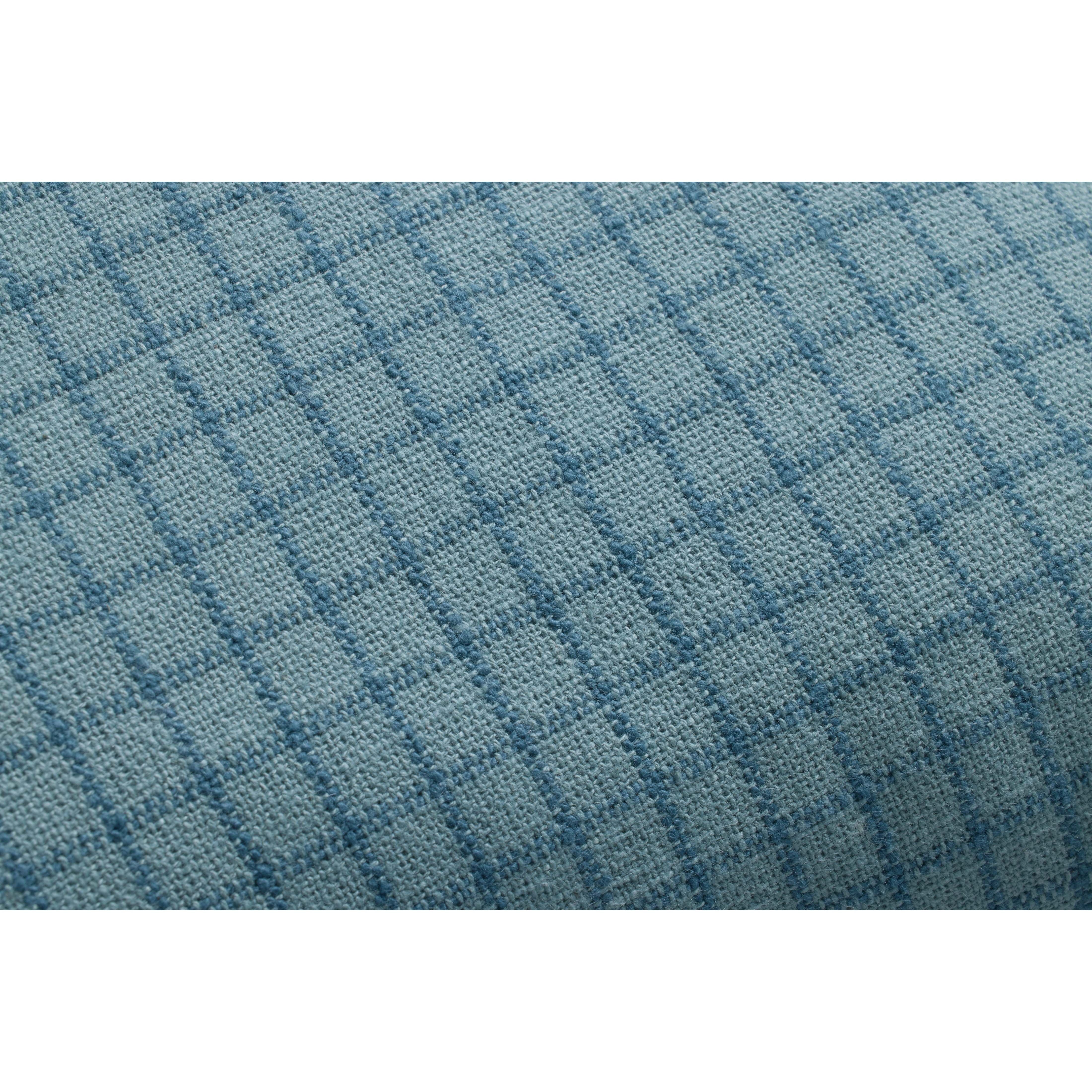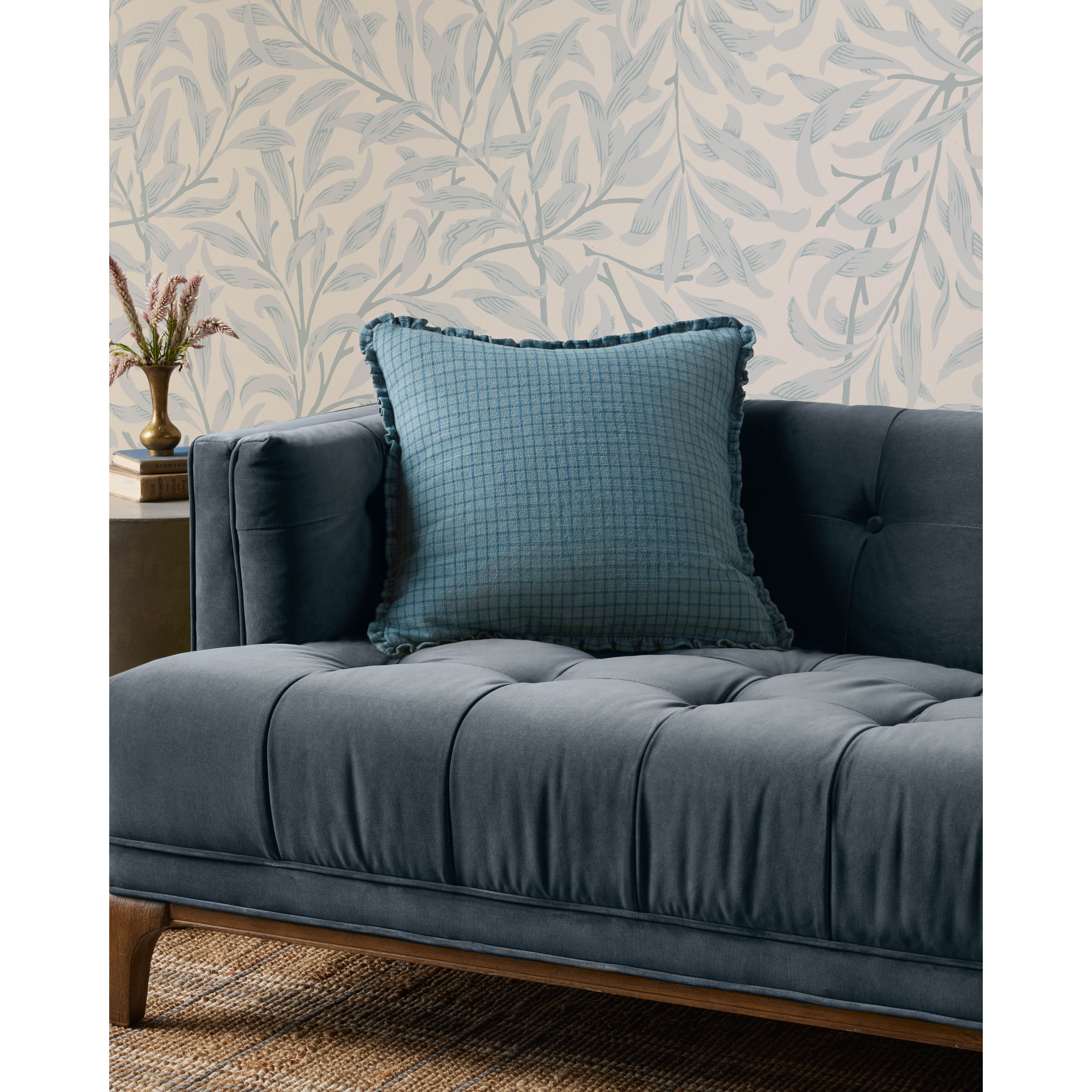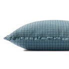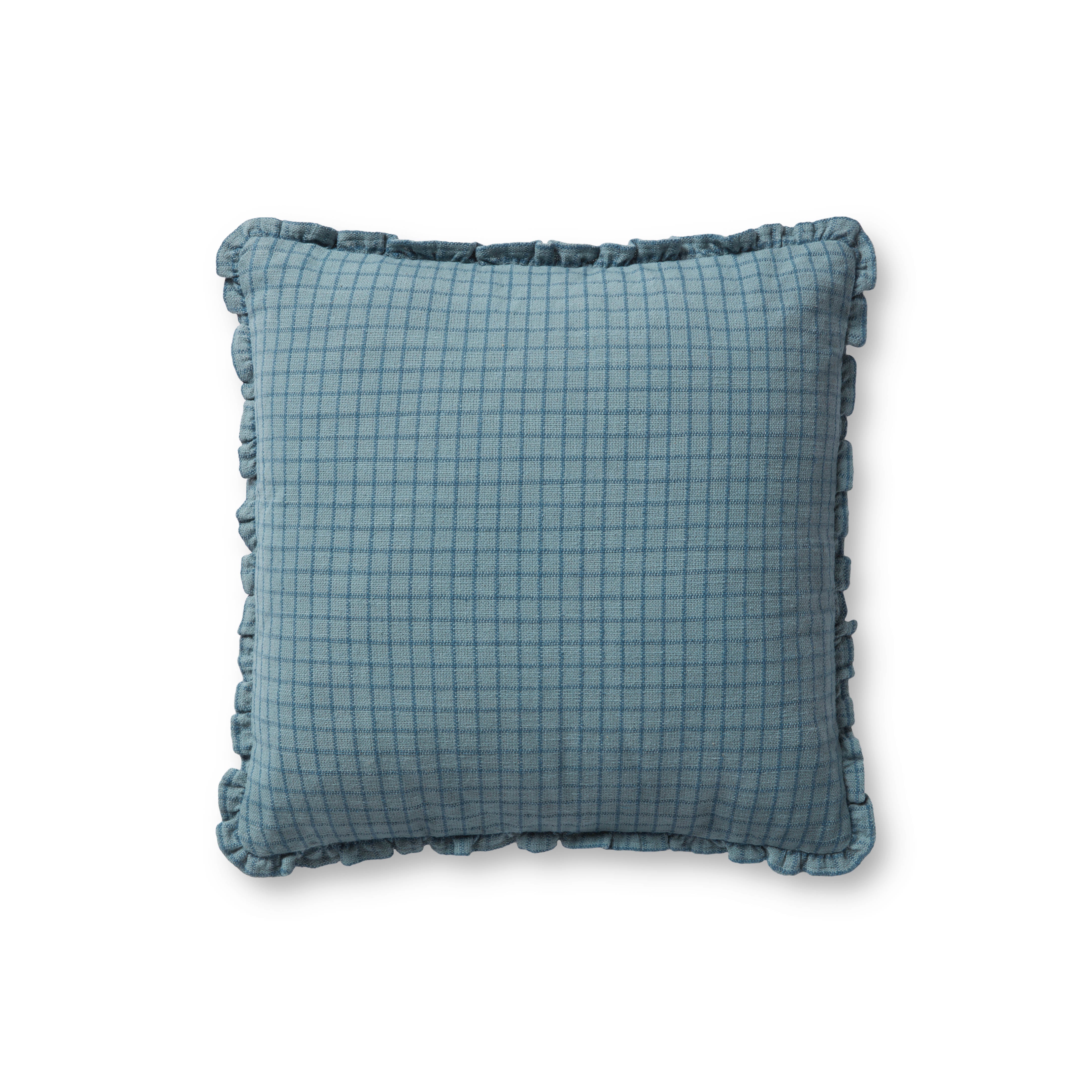 The ocean blue Dinah throw pillow from Chris Loves Julia x Loloi features a subtle gridded pattern framed with short ruffles for a sophisticated playfulness. The pillow is made of 100% cotton and measures 18” x 18”, a standard size to style in living rooms and bedrooms.