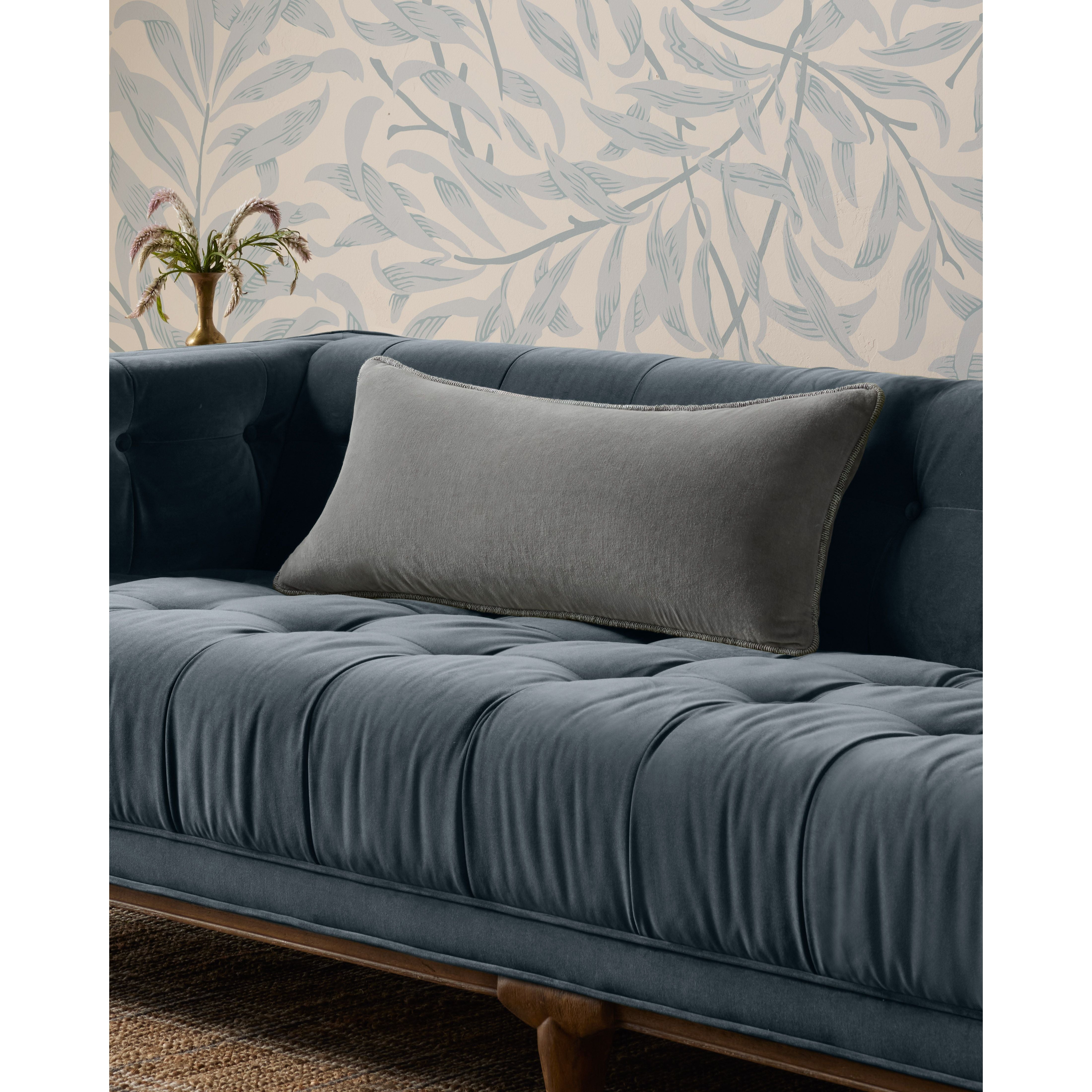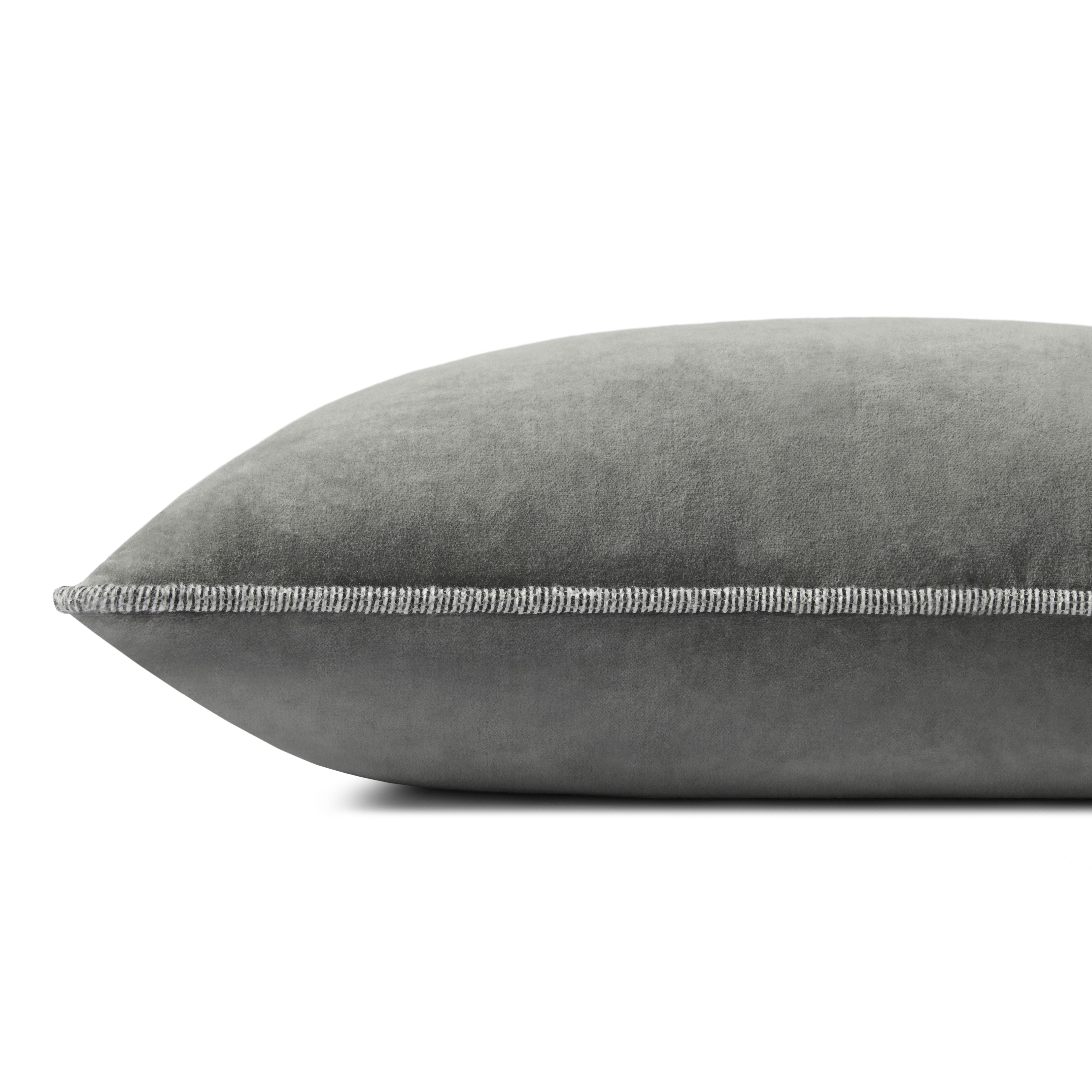 Liza is a grey velvet throw pillow from Chris Loves Julia x Loloi framed with piped edges. The pillow cover is made of 100% cotton and measures 12” x 27”, an elongated size to style in living rooms and bedrooms.