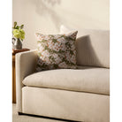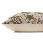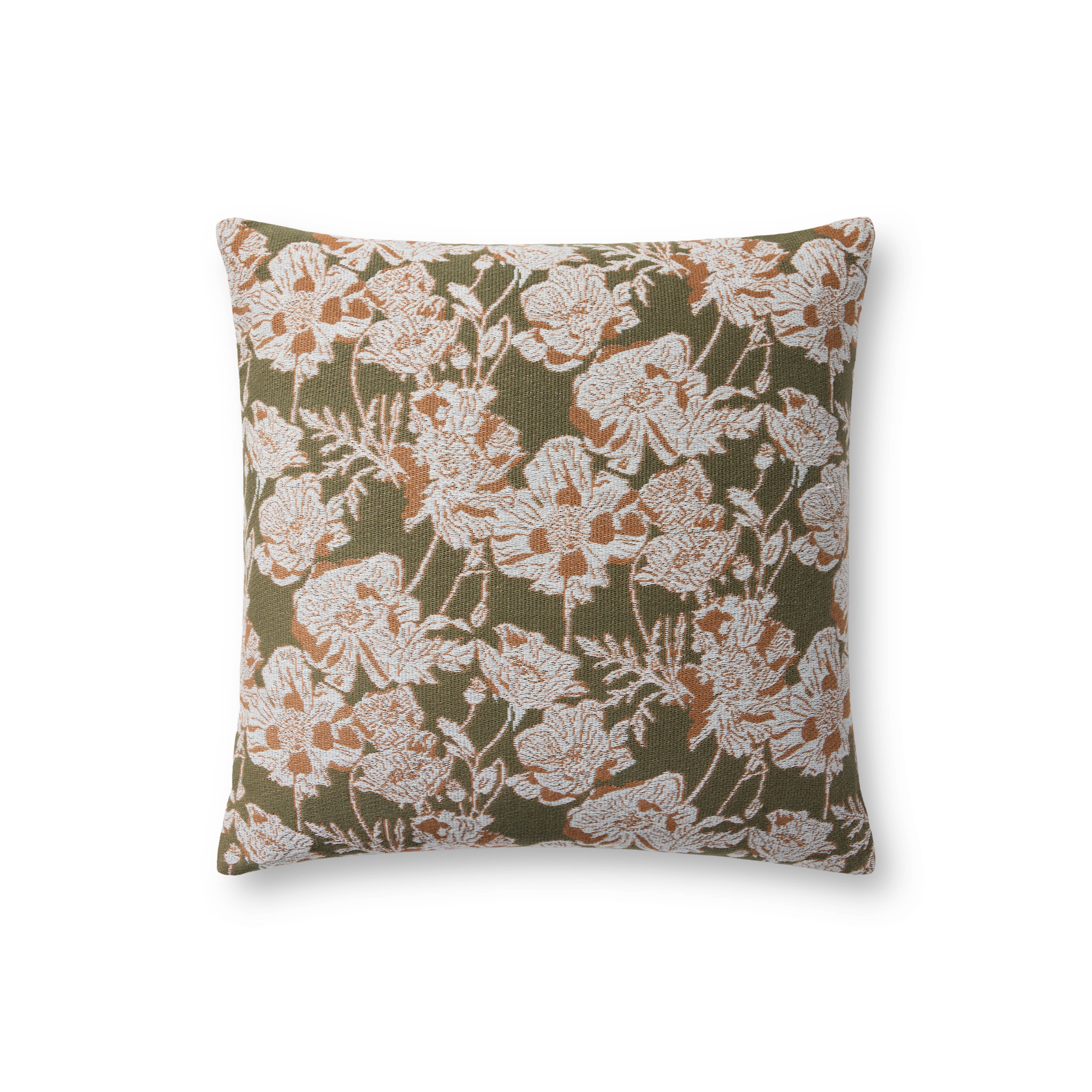 Matilda is a jacquard woven throw pillow from Chris Loves Julia x Loloi with ivory and brown hand-drawn florals against an olive green background for a sophisticated multi-tonal look. The pillow cover is made of cotton and polyester and measures 18” x 18”, the perfect size to style in living rooms and bedrooms.