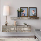Abstract Block Floating Shelf from Global Views is a sculptural wall shelf that elevates functional storage into luxury décor. Crafted from solid wood and sheathed in a hand-finished metal sheet with a protective coat, its post‑modern geometric relief reads as subtle architecture—clean lines, textured panels and inset planes create a refined, tactile presence on the wall.
