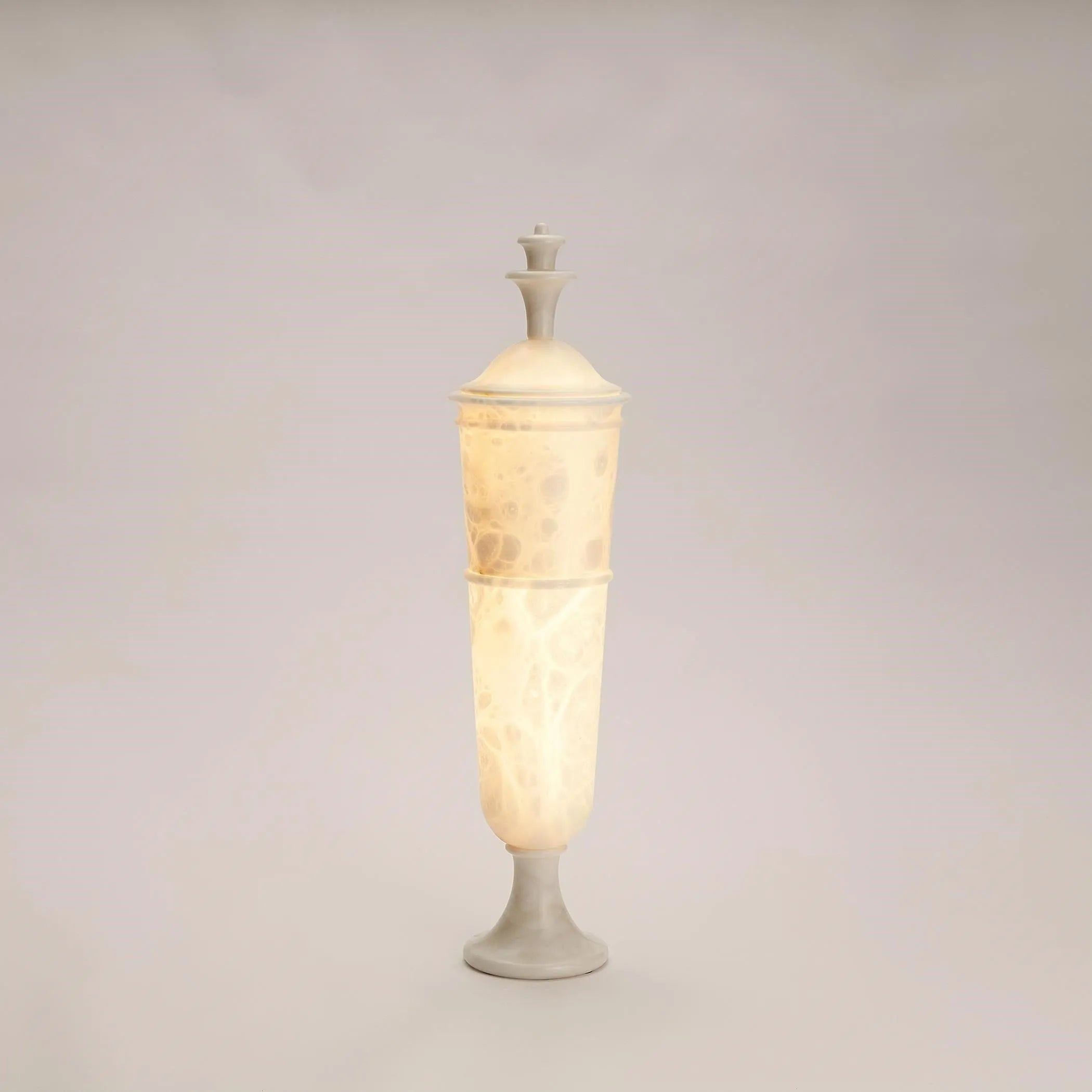 Alexander Alabaster Lighted Urn by Global Views is a sculptural statement that merges material integrity with refined illumination. Carved in translucent alabaster, its elongated urn form and classical lid finial cast a warm, ambient glow that reads as both object and light — perfect for curated interiors and hospitality projects.
