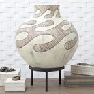 Anasazi Vessel — a sculptural object that balances ancient inspiration with contemporary restraint. Hand-finished by Global Views, this round ceramic vessel reads as refined accentware: a soft matte cream surface marked by rhythmic brown linear motifs and a subtly distressed patina.