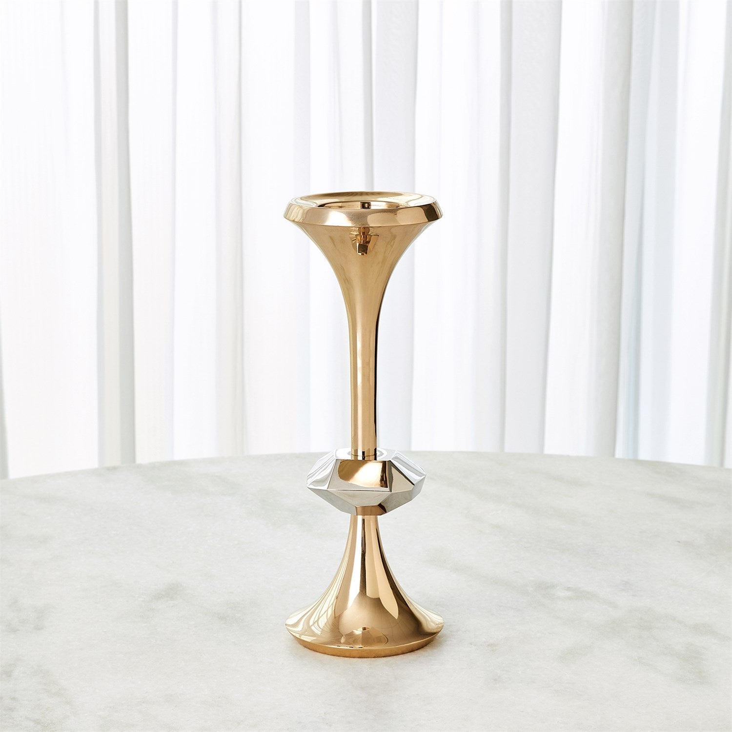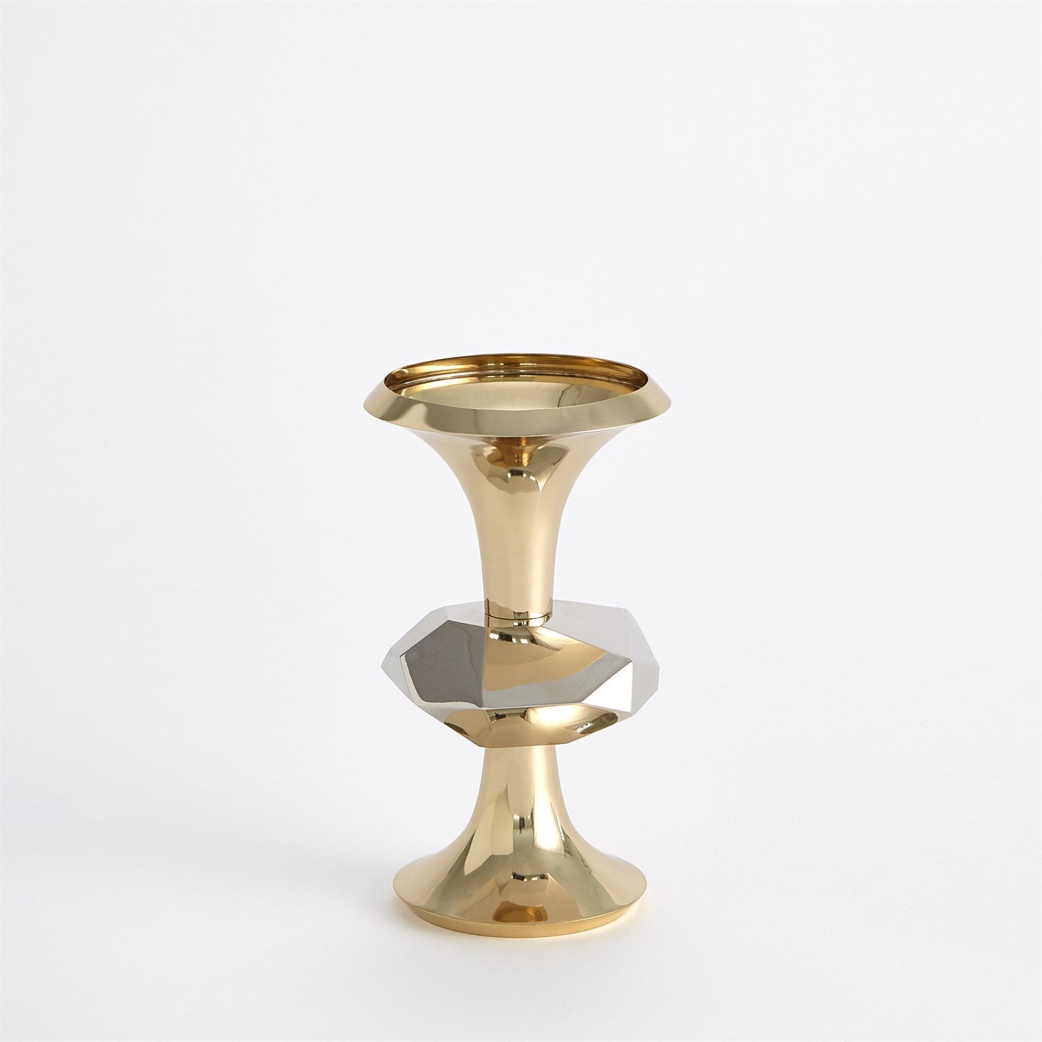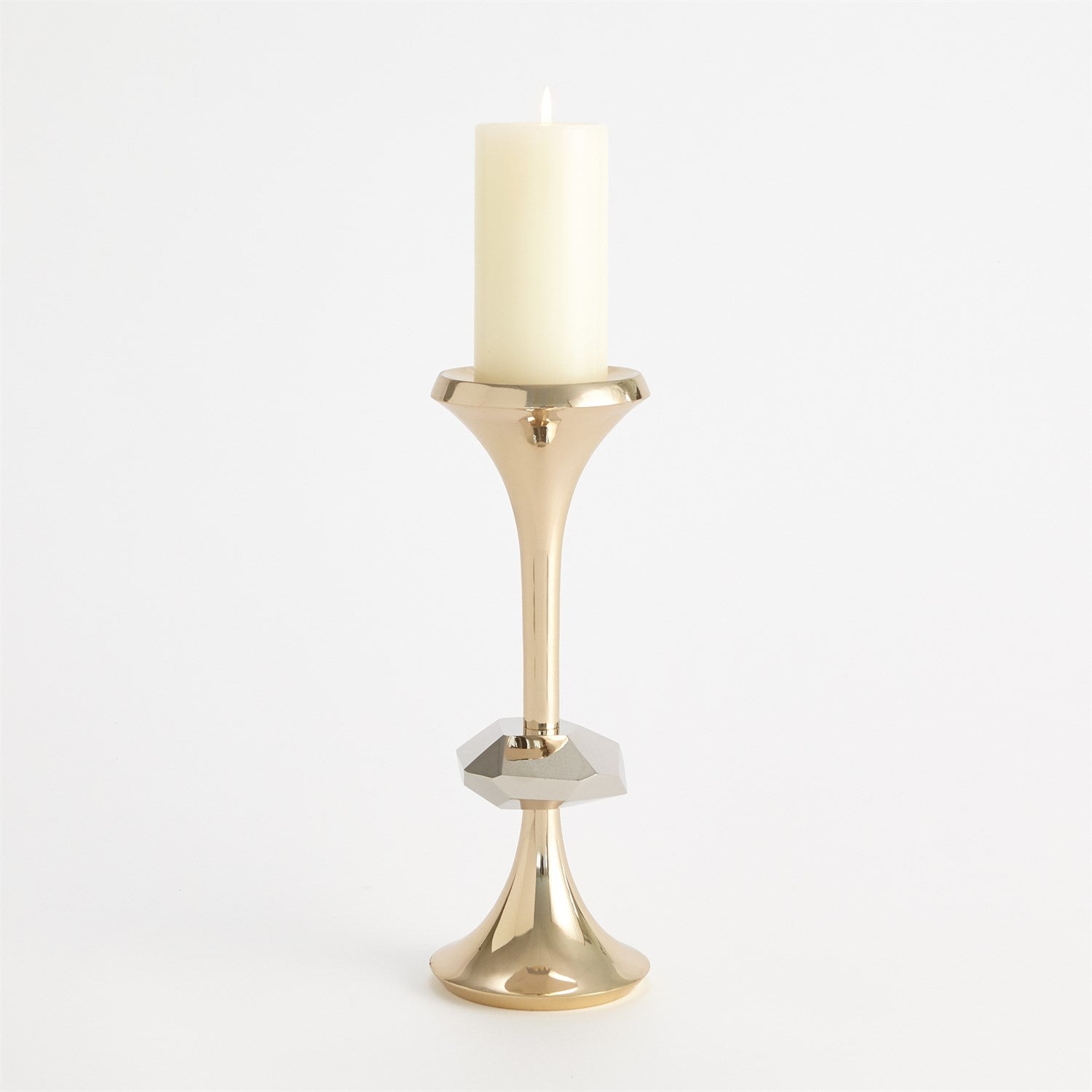 The Gabriel Brass Candle Holder is made of shiny brass and nickel-plated brass. Holds 3 inch pillar candle.