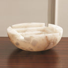 Stepwell bowl is carved out of solid alabaster with a step down 3D pattern. As alabaster is a natural product, please be aware that there will always be variations in veining and color. This is to be expected and makes every alabaster product uniquely your own.