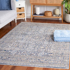 Harlow HAR163M Ivory Blue Grey rug, a versatile addition to any home decor. The Harlow collection features classic motifs in inviting earth tones that never go out of style. Perfect for adding a touch of elegance to your living space, these decorative area rugs are adorned with understated fringes for a charming finish. Crafted using high-quality synthetic yarns and power loomed construction, this rug is designed to withstand the test of time while providing a cozy feel underfoot. Elevate the ambiance of any room with the timeless appeal and durability of the Harlow Ivory Blue Grey rug.