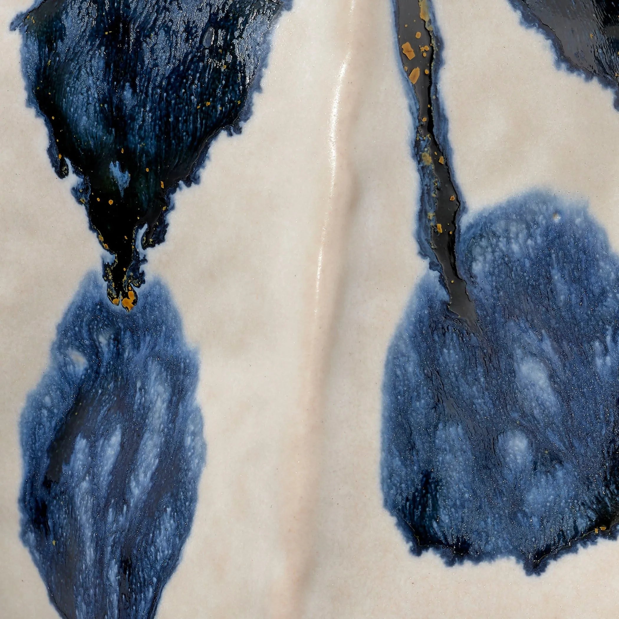Artfully handcrafted from fine ceramic, these bright and cheerful vessels showcase bold splashes of blue reactive glaze. To enhance their organic shapes, the ruffled openings are rimmed in the same hue. The glazing technique reacts uniquely on each piece, ensuring that no two are completely identical.