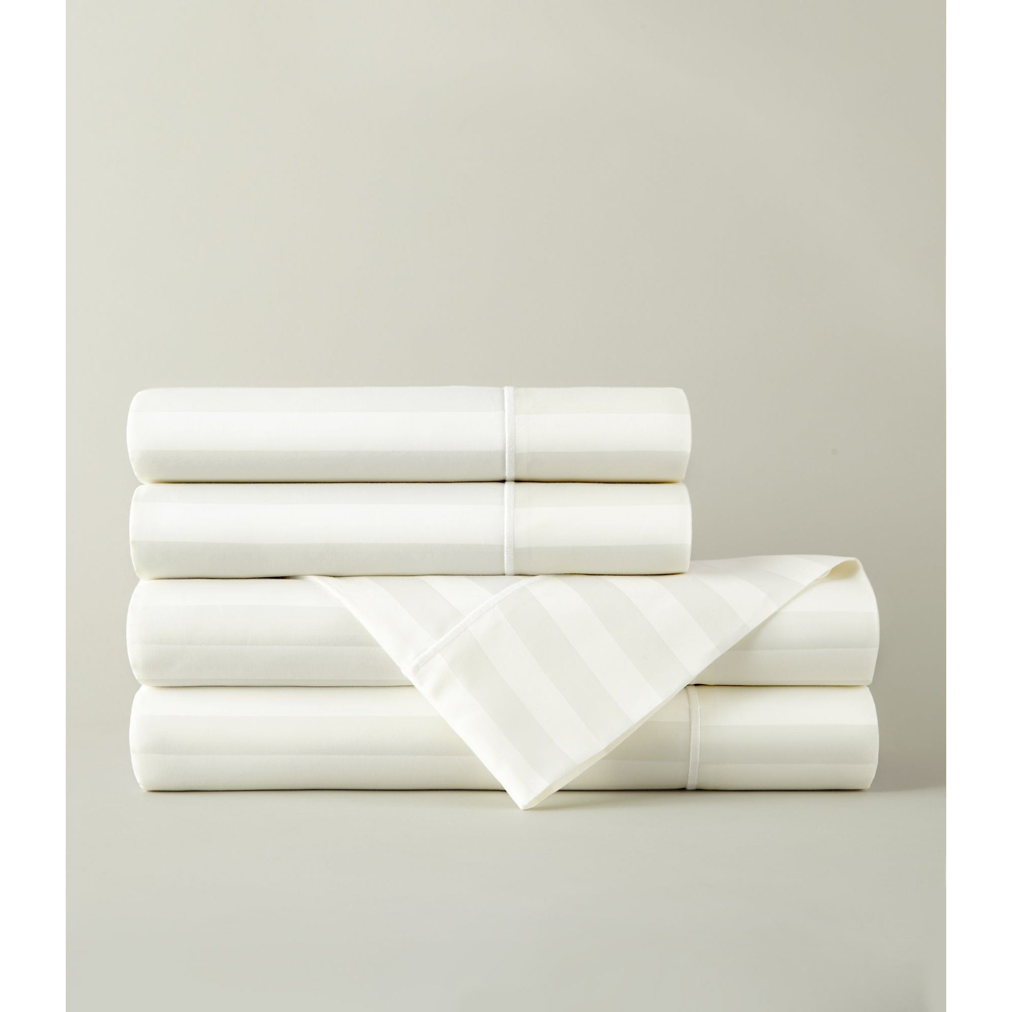 - Features tone on tone 3/4" damask stripes with a satin stitch on the hem of the flat sheet and pillowcases - 4" cuff.