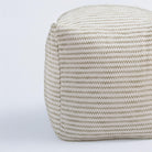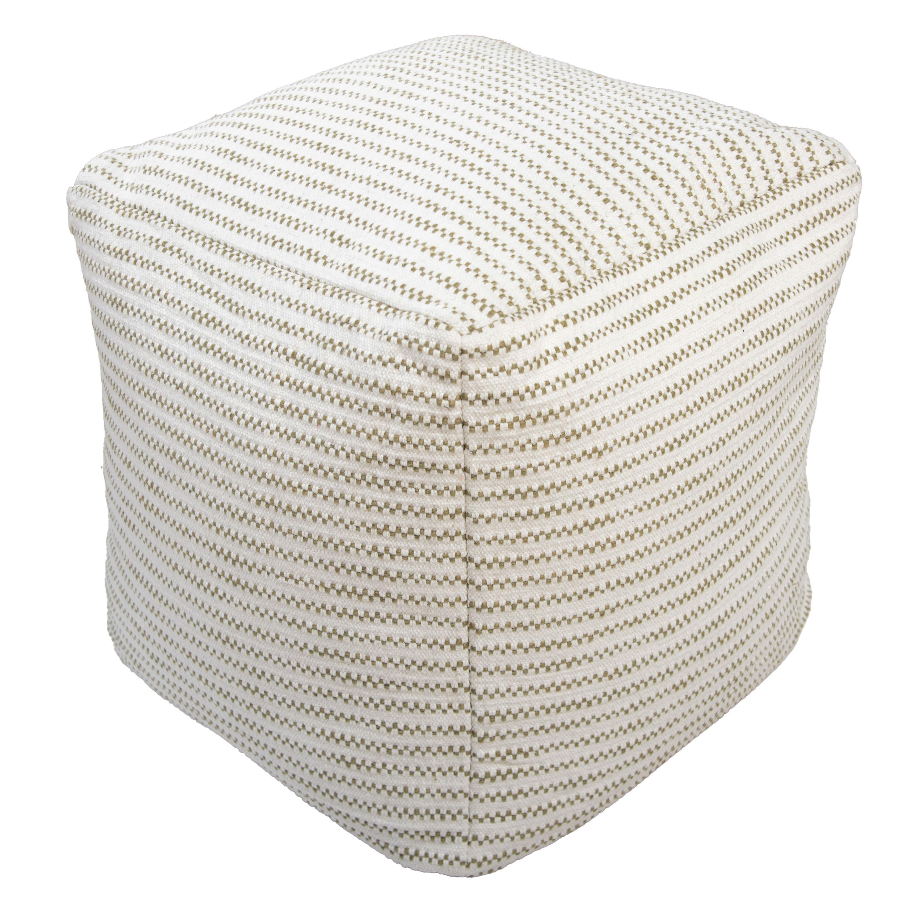Transform your living space with the understated elegance of the Rizzy Home Pouf. At 18"x18"x18", this stunning piece combines contemporary design with versatile charm, blending seamlessly into any aesthetic—from modern minimalist to boho chic. Handloomed from a soft cotton and polyester blend, this pouf showcases a subtle interplay of green and ivory in an abstract stripe pattern. The weaving creates a beautifully mottled effect, offering texture and depth while maintaining a neutral palette that compliments any decor. Thoughtfully designed for style and function, it features a durable inner lining and a secondary inner lining that secures the polystyrene bead fill, ensuring lasting comfort. The recycled canvas bottom panel adds an eco-conscious touch, while the locked zipper prevents any access to the interior for enhanced safety and durability. Perfect as a footrest, extra seating, or simply as a statement accent, the Rizzy Home Pouf is both practical and visually striking. Spot-clean friendly, it’s a functional yet sophisticated addition to your home that will elevate your space effortlessly.