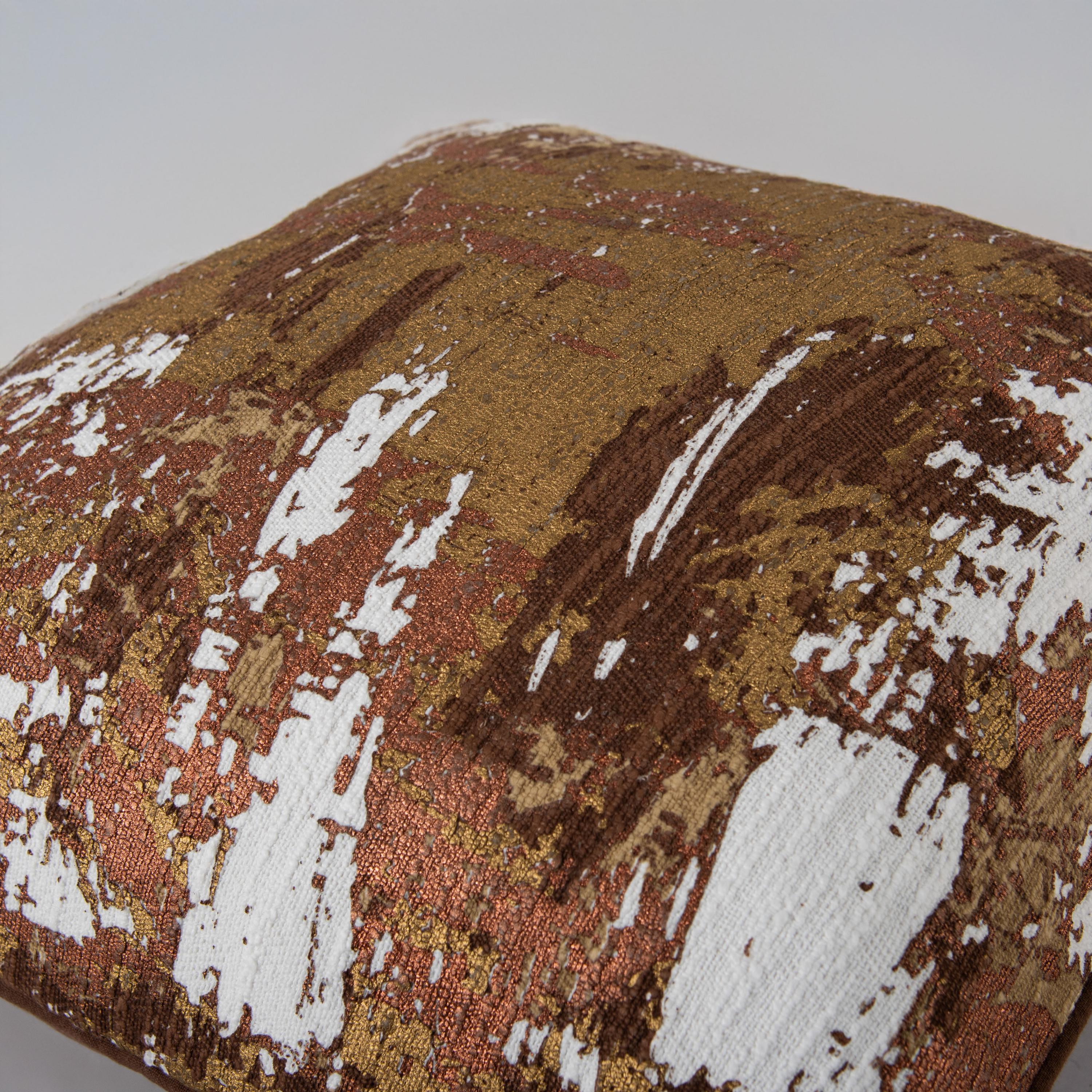 A fusion of art deco and modern industrial style blend together on this glamorous throw pillow by Rizzy Home. Made from heavily textured cotton slub, it features a striking printed pattern and is accented with bold silver and gold metallic foil. The glammed metallic collage in a stunning palette of ivory, copper, and gold brings a luxurious touch to any decor. This pillow is finished with welted edges and a solid coordinating back with a hidden zipper closure, giving it a refi ned and sophisticated look. Polyfilled for plush comfort, it is as practical as it is visually captivating.