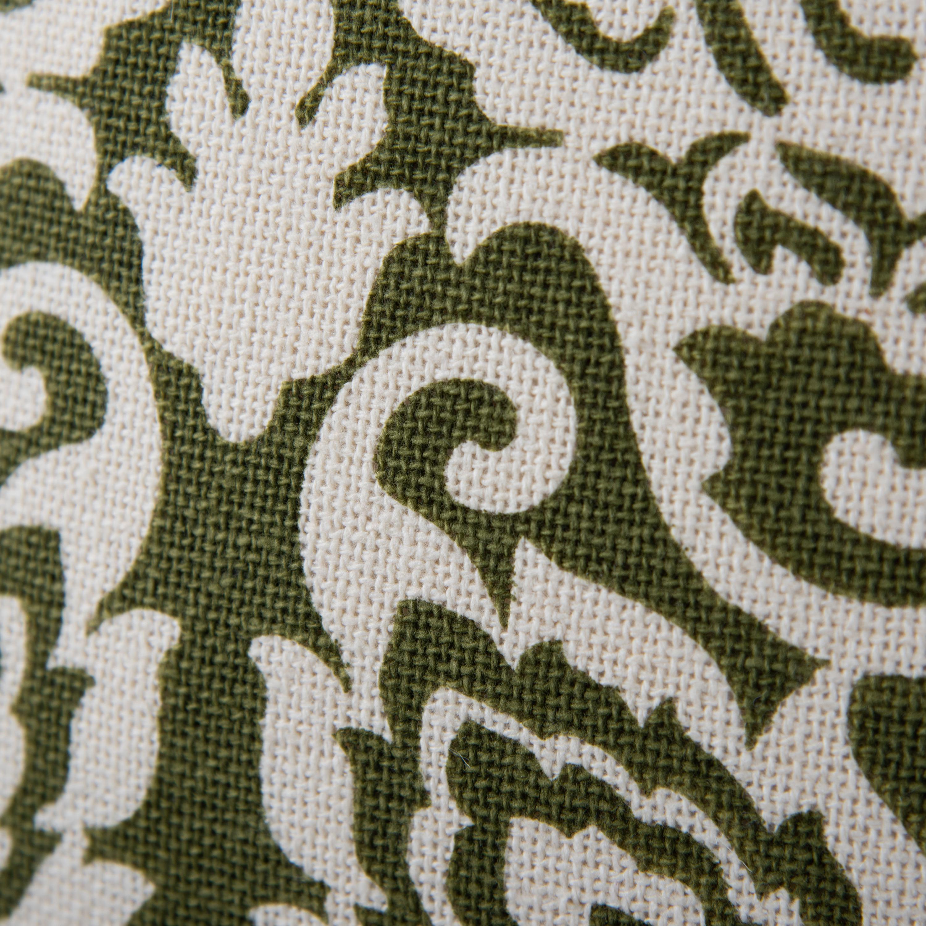 Made from durable cotton burlap material, it features a printed damask pattern with a distressed effect, adding a touch of rustic elegance. The subtle green pattern on a natural background brings a traditional flair to your décor, while the light texture and knife-edge finish offer a clean, polished look. Perfect for adding character to any space, this pillow is a versatile and stylish accent.