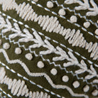 Crafted from durable cotton duck material, this modern-crafted pillow features an intricately embroidered geometric pattern in ivory stitching against a green backdrop, creating a striking visual contrast. A solid back with a hidden zipper closure ensures seamless styling and versatility.