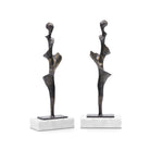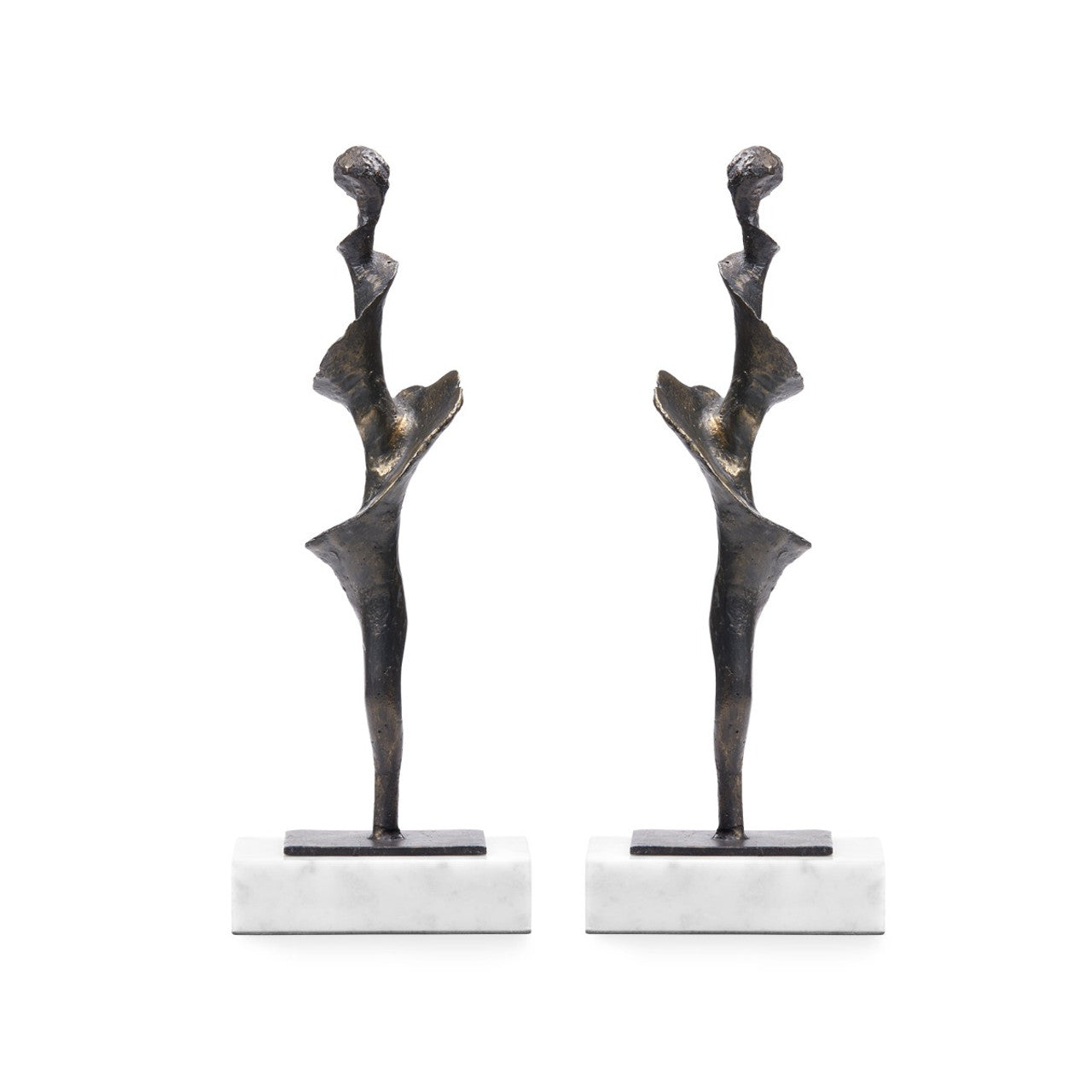 These abstract bronze-finished iron statues are influenced by the natural elements of the ocean. Our artisans sand-cast each piece giving the Spiral Statue an earthy texture and the shape of an eroded conch shell on the shore. A beautiful organic form that disappears over time but is rendered in a durable material to take on a more substantial presence. Its white marble base makes it perfect for display on your bookshelf, console, or in your home office. Sold in a set of 2, these statues will balance any living space gracefully.