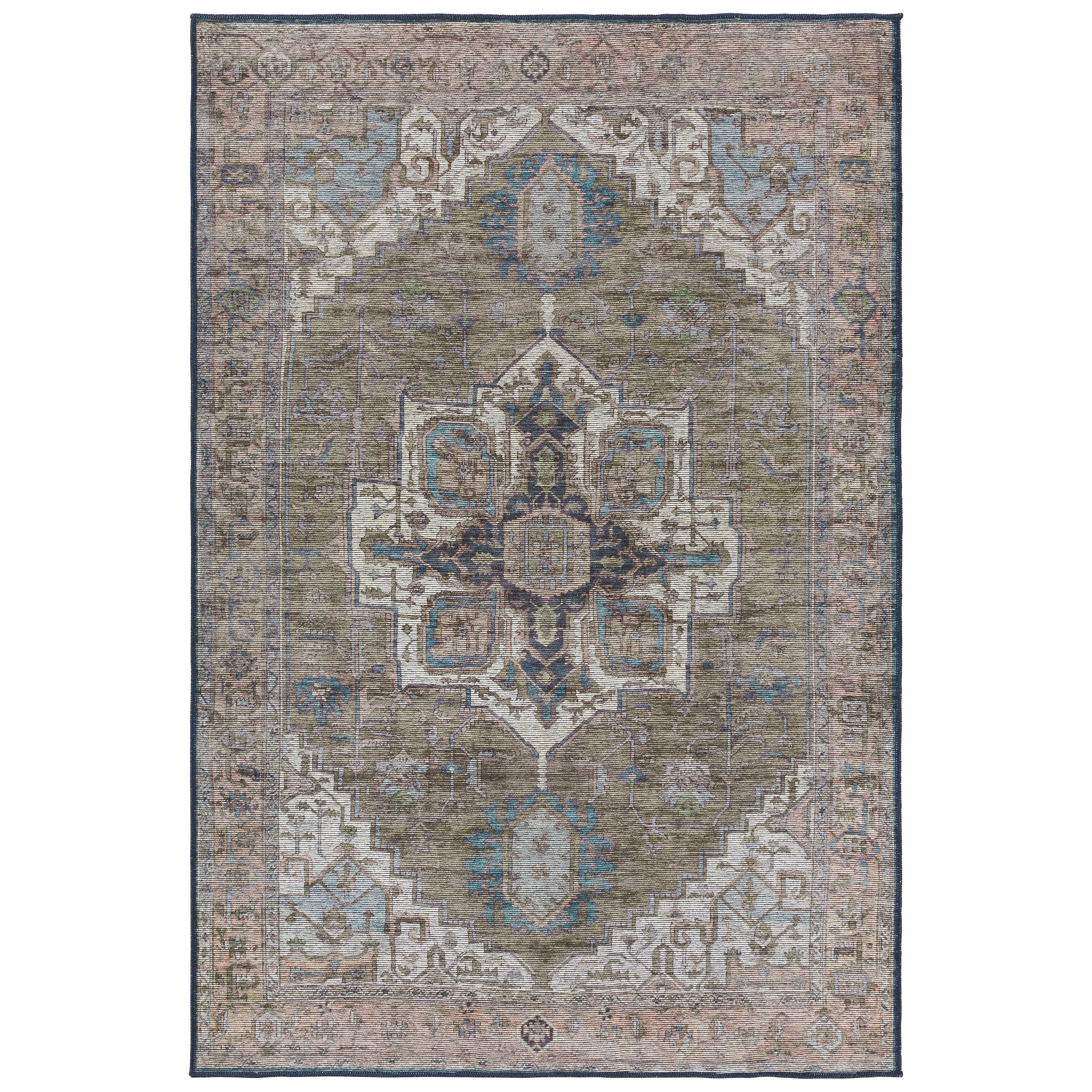The Vindage collection melds vintage inspiration with on-trend colorways and durability for lived-in spaces. This digitally printed assortment features deep, rich tones and stunning abrashed designs that lend heirloom style to any home. The Chaplin area rug depicts a distressed medallion pattern with floral detailing in rich tones of green, blue, dark brown, pink, cream, and navy. The easy-care design withstands pets, children, and high traffic areas of the home such as living rooms, dining areas, kitchens, and bathrooms.