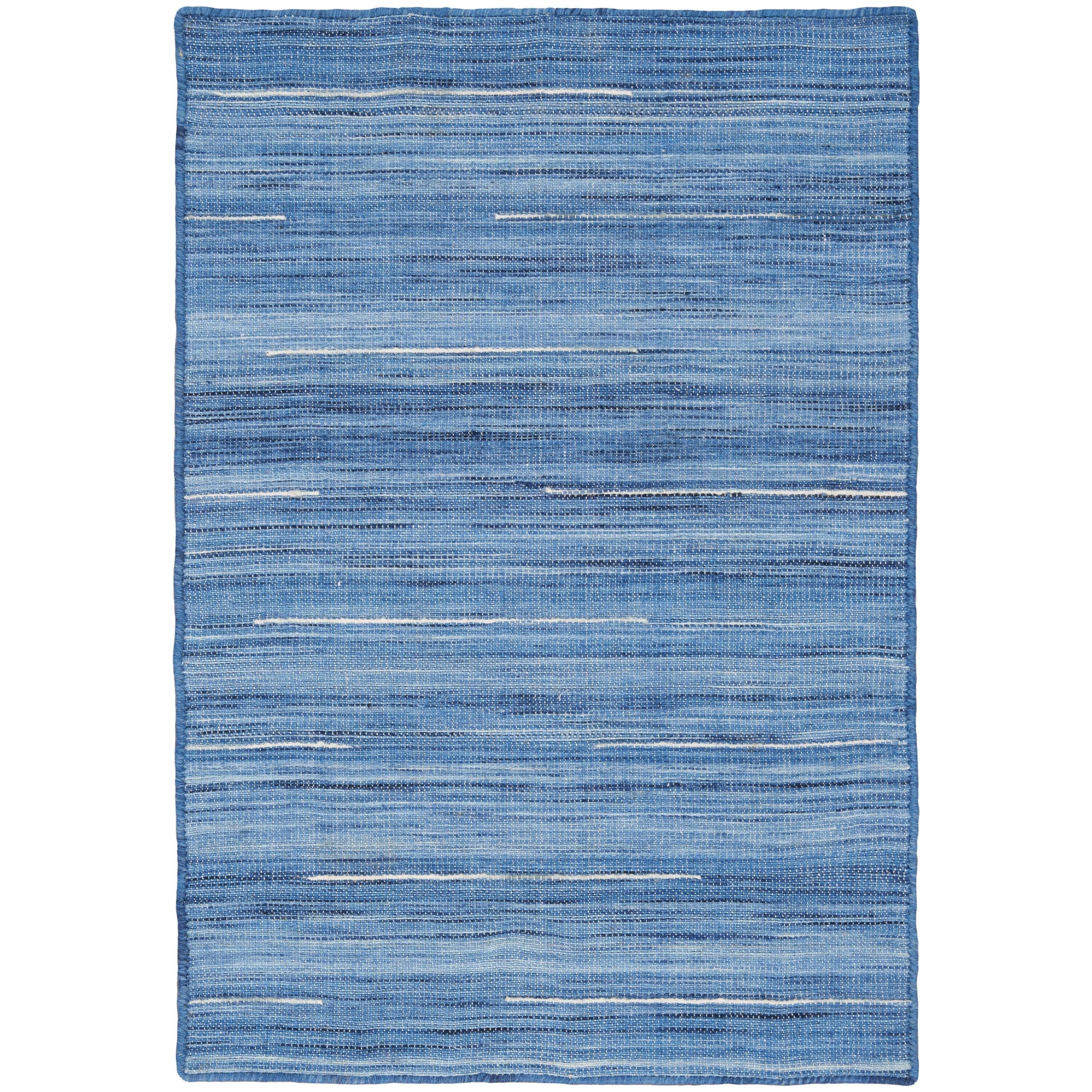 Interweave IWV01 Denim, a stunning addition to the Interweave Collection of area rugs. Handmade from a luxurious blend of wool and cotton, this flat weave rug is designed to bring visual intrigue to any space in your home. The multi-tonal ground is intricately woven with ombre-colored yarns of varying lengths, creating a striking pop of color that instantly elevates your decor.