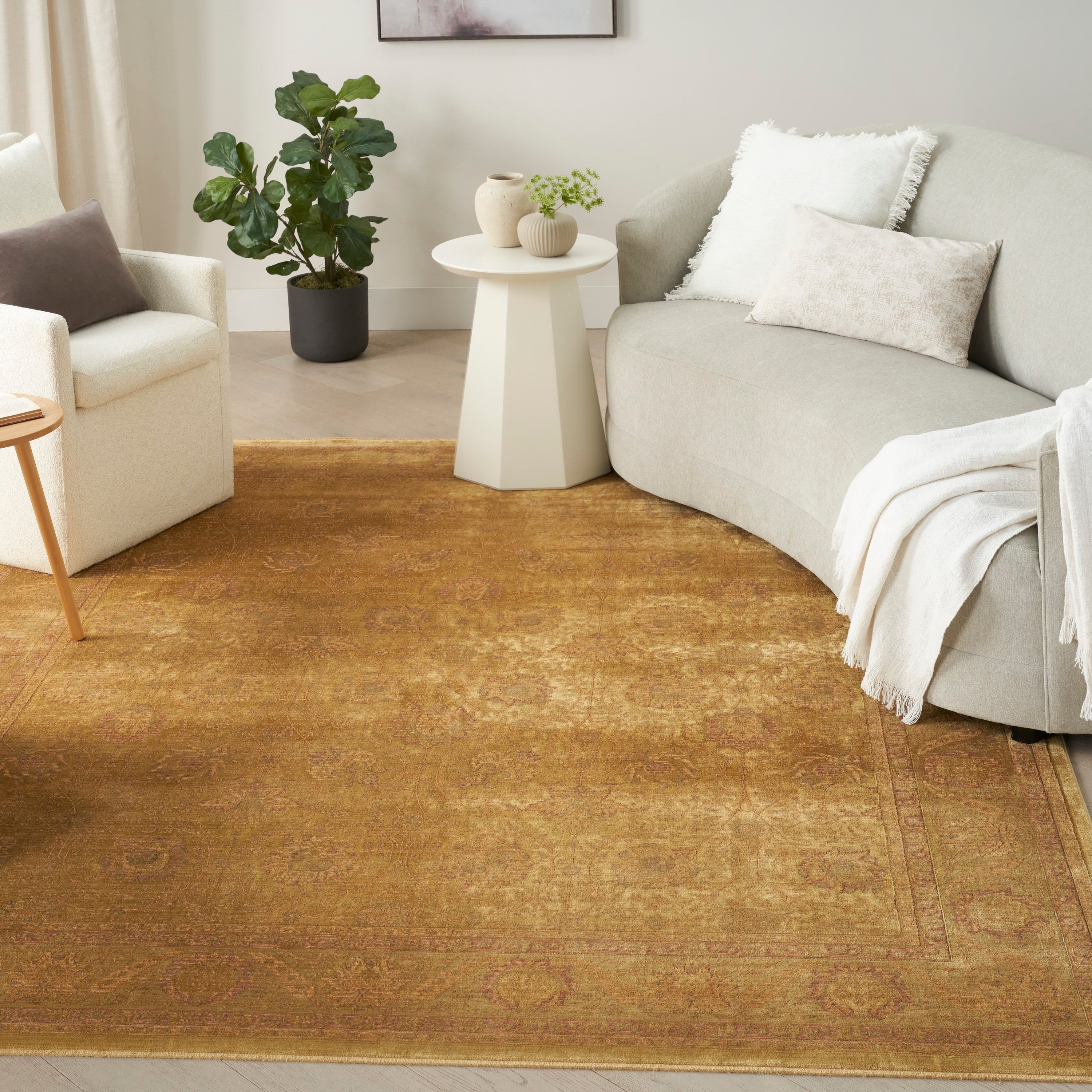 Luxurious LRS02 Gold rug, a timeless piece that beautifully merges history with modern elegance. Crafted from premium stain-resistant silk-like yarns, this Persian-style rug exudes a luxurious vibe while boasting a vintage-inspired floral pattern that adds character to any room.