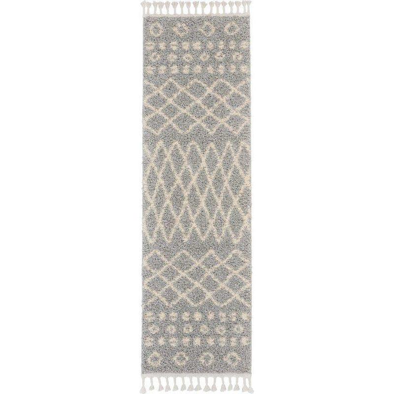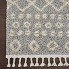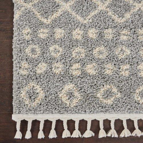 Introducing our Moroccan Shag MRS02 Silver area rug, a luxurious addition to your space. Immerse yourself in an exotic atmosphere with this super-soft rug featuring cream-colored tribal patterns set against a silvery grey shag pile. The artisanal design, complete with twisted fringe, adds a touch of elegance and charm to any room. Embrace the Moroccan-inspired trend effortlessly with this stunning piece.