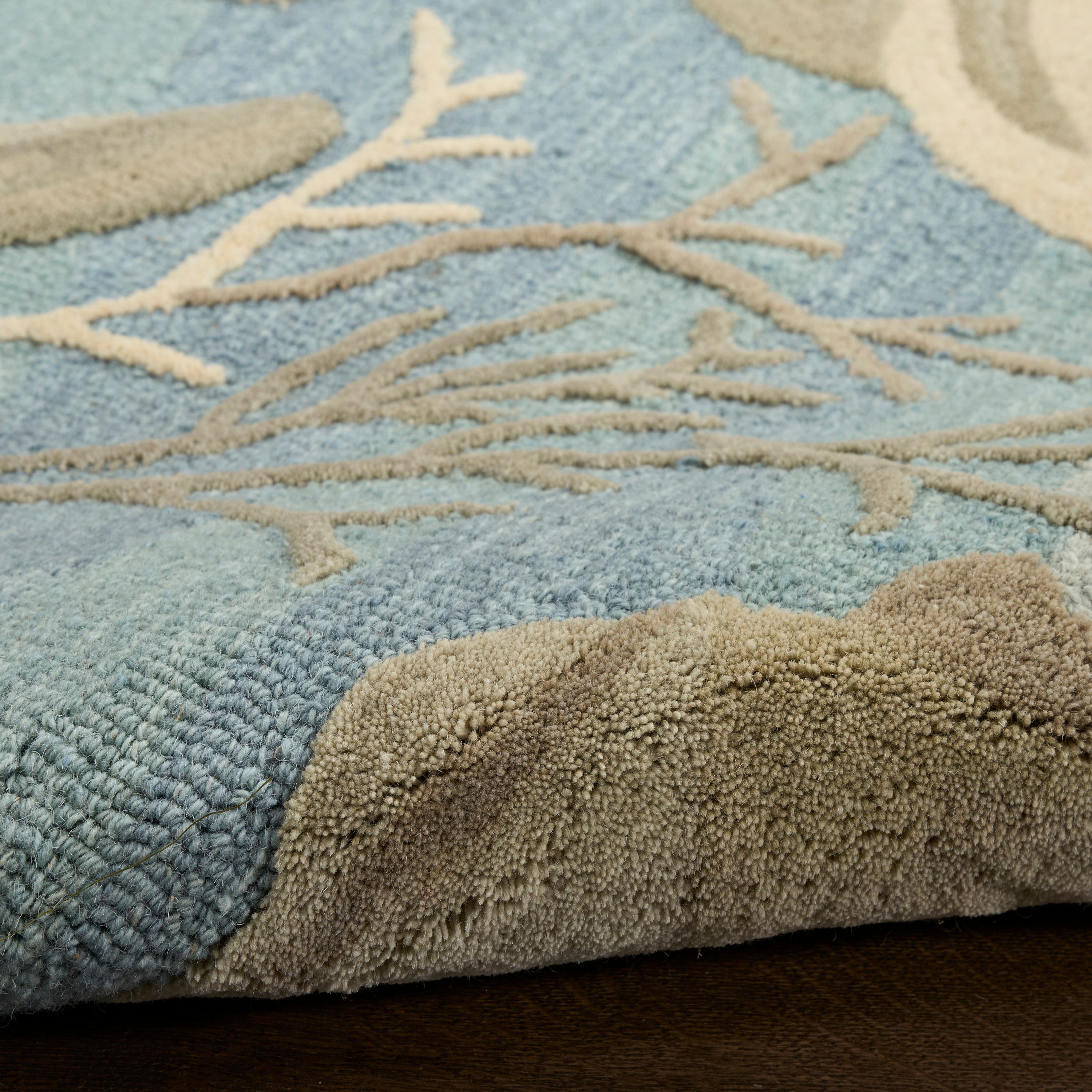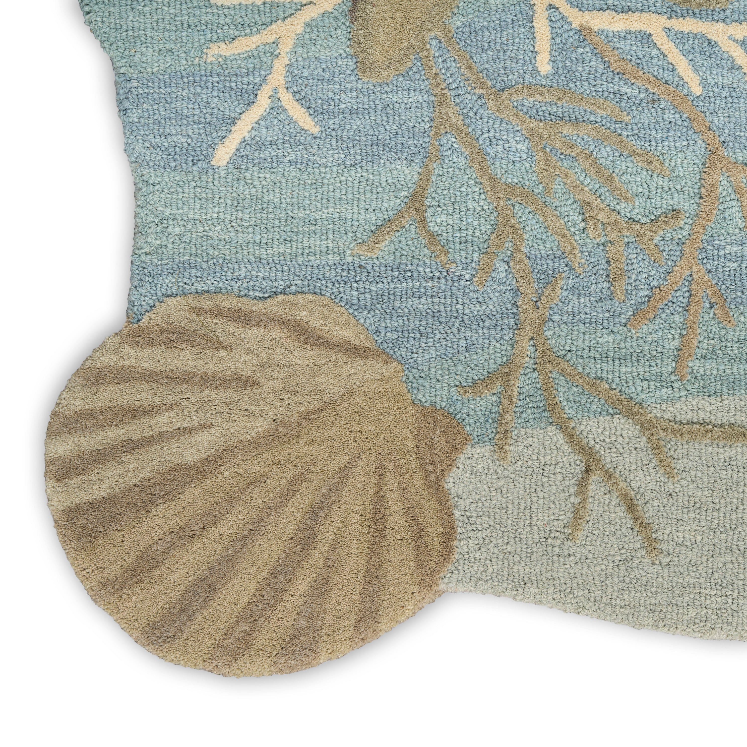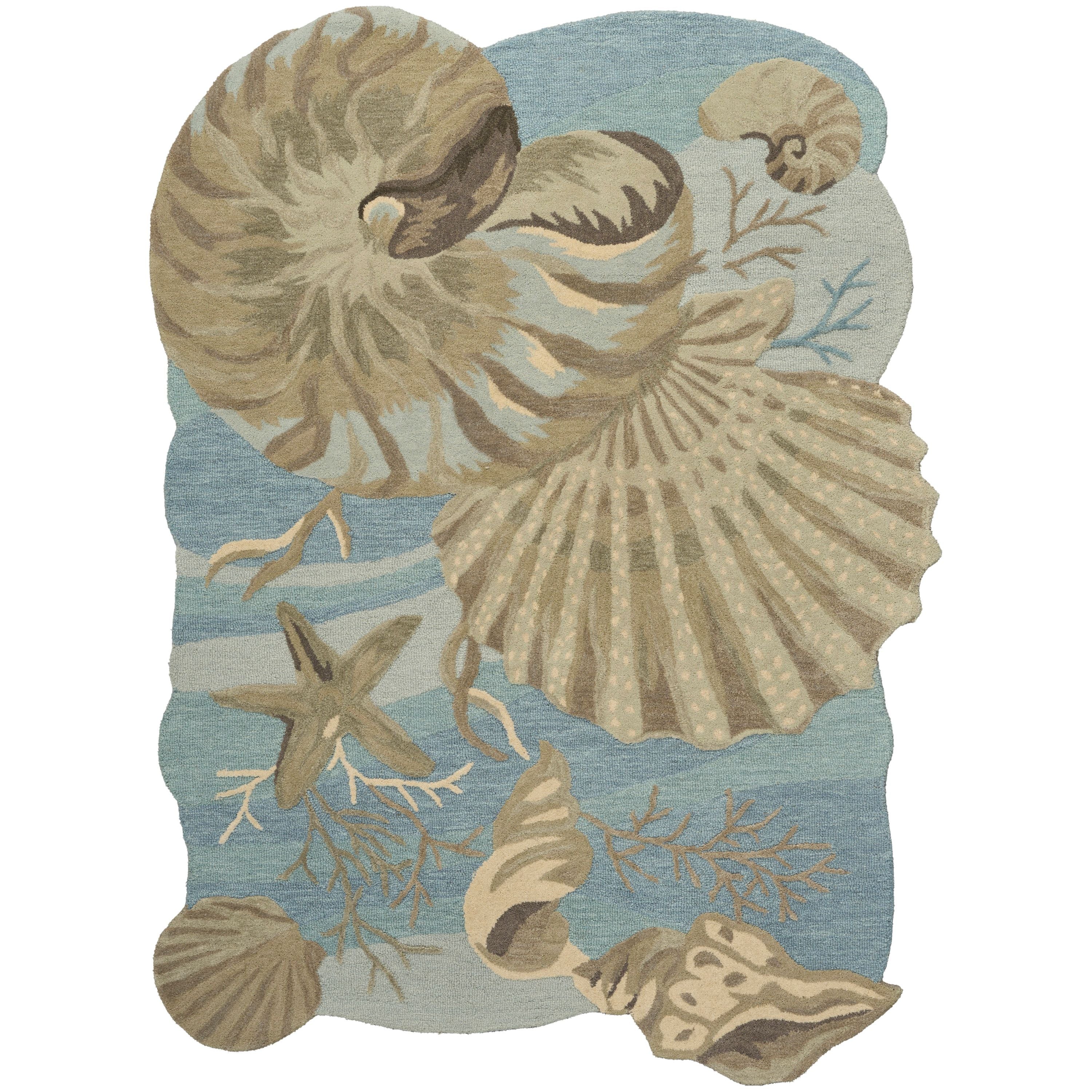 Add nautical flair to your home with this coastal rug from the Waterside Collection. The uniquely shaped design showcases an underwater vignette featuring starfish, coral, and seashells on a ground of multi-tonal blues. Hand-tufted with 100% wool for lasting style and comfort.