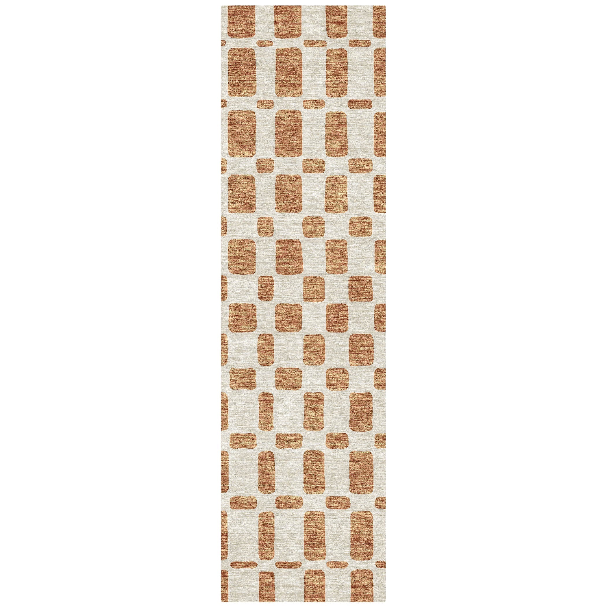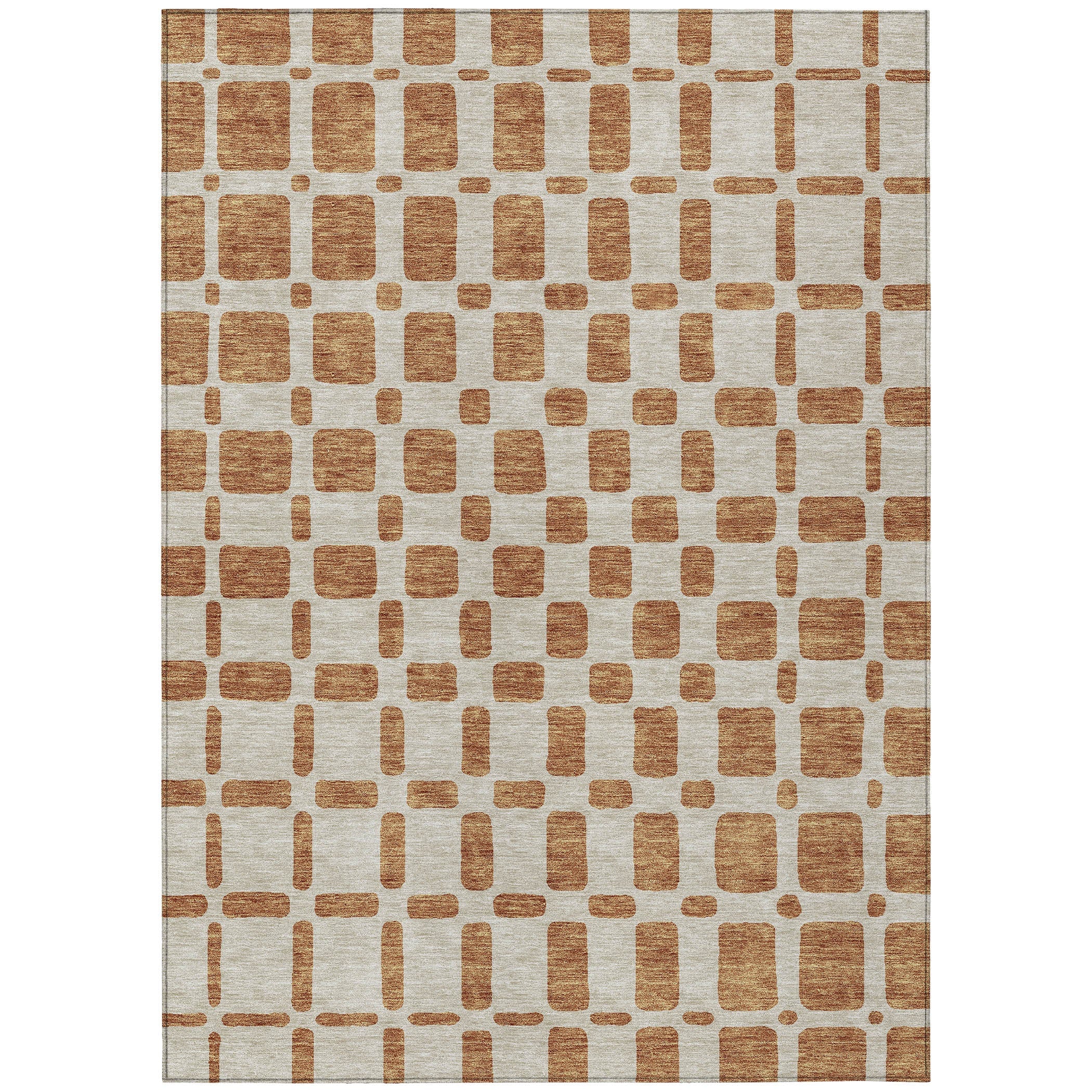 Enhance the ambiance of your home with the Chantille ACN871 Terracotta area rug. Its unique design showcases a variety of square shapes arranged in a captivating criss-cross pattern, blending seamlessly with transitional decor styles. The square motif brings a contemporary and lively feel to any space, instantly updating your room's look.