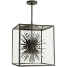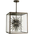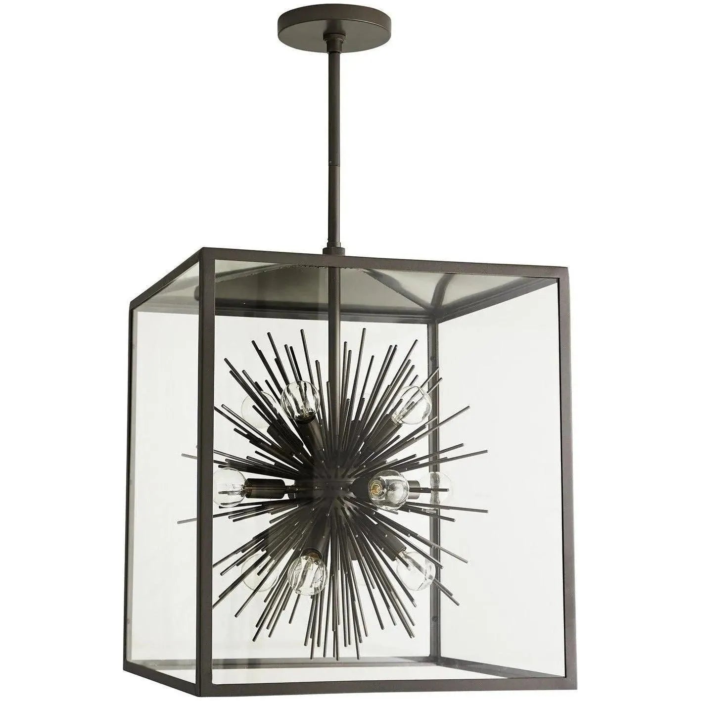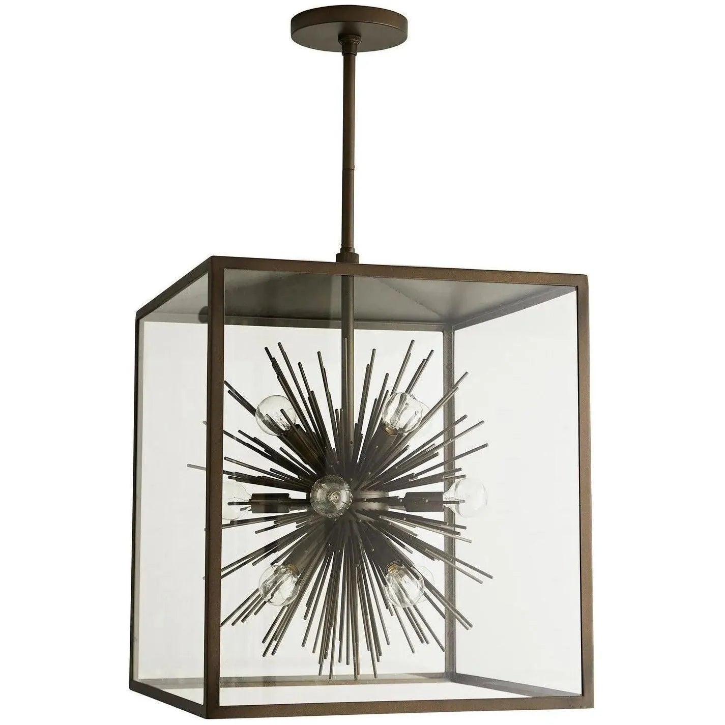 Inherently vibrant this version of the Zanadoo pendant is an outdoor friendly version of one of our most iconic designs. In this design the modern starburst design is concealed in an aged iron steel frame and clear glass panels. Approved for use in outdoor areas. Additional pipe available (PIPE-191). Also available in Aged Brass (49226).