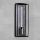 A wall light made from a matt black metal and glass cage, complete with a sand cast metal back panel. It features a solid metal, cross knurled, lampholder with our signature coin screws. IP44 rated and ADA compliant, suitable for wet locations, bathroom and outside use. Available in Steel, Brass, Gun metal, Black + Steel, Black + Brass and Black + Gun Metal finishes. Protected against water splashed from all directions, with limited ingress. In some cases, moisture may get into the cage but will evaporate after a short time through drainage holes.
