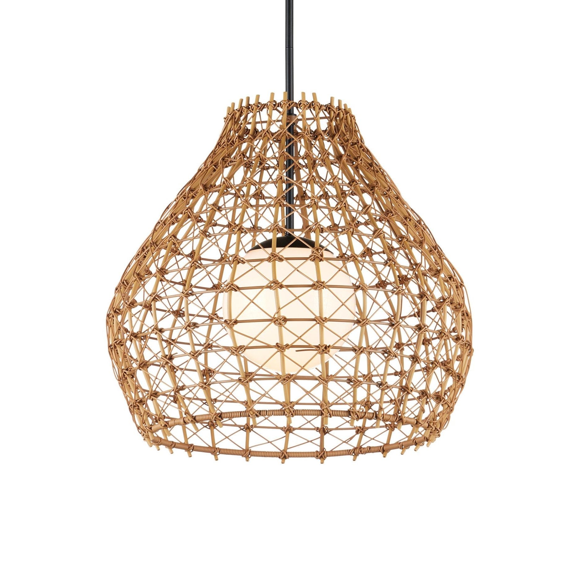 The Bly Outdoor Pendant brings artisanal charm to exterior spaces with its eye-catching crisscross pattern, meticulously woven from all-weather synthetic wicker. The large-scale design offers a handcrafted look, while the intricate weave adds depth and texture that feels both refined and relaxed. A black powder-coated metal frame ensures durability and contrast and the pendant is wet-location tested. Adjustable from 25" to 66.5" with use of included chain/rod kit/cable. If your space calls for a longer drop, additional chain/rods/cable is available for purchase.