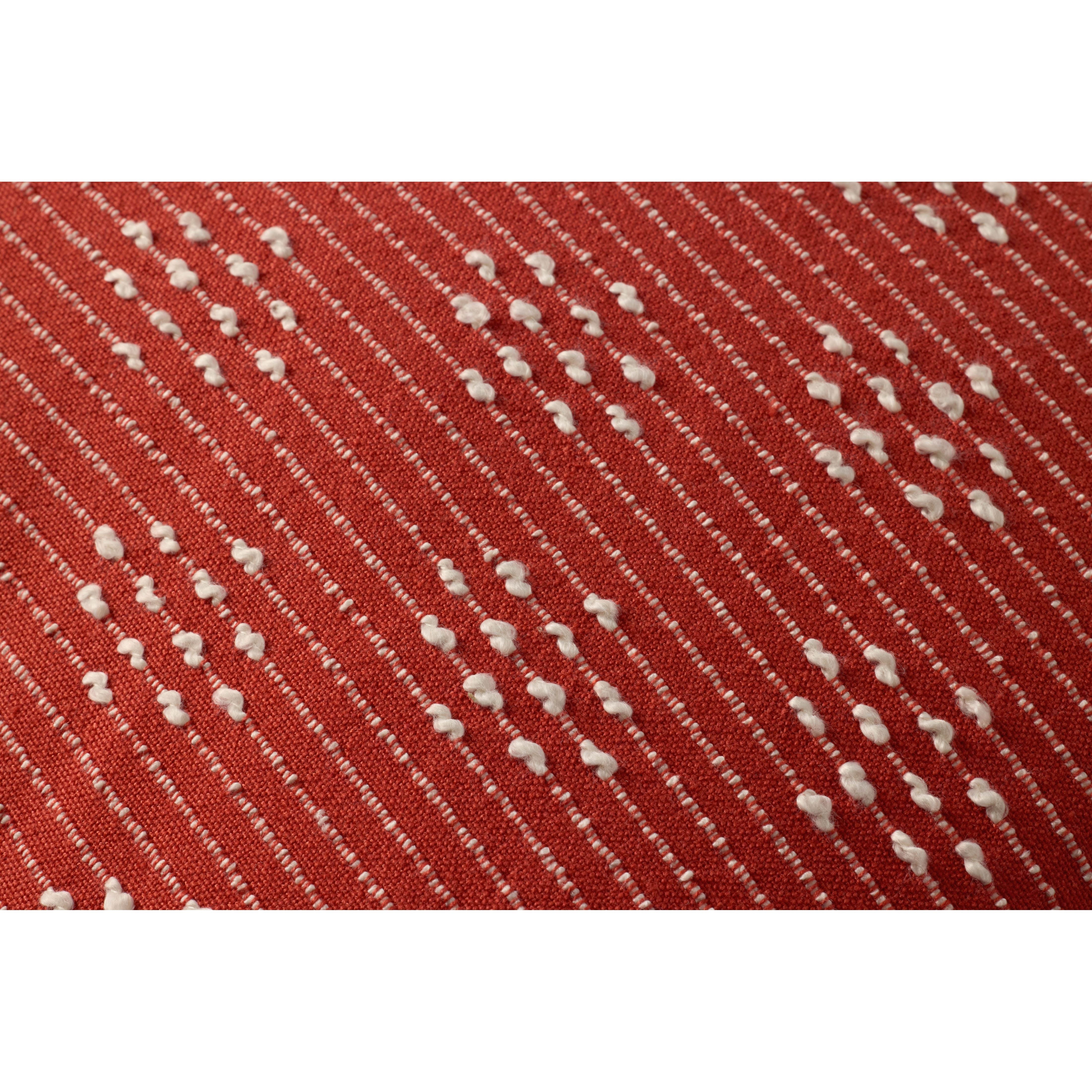 This vibrant red throw pillow features a white geometric design and tan flange, adding a pop of color to your home decor. The 20” x 20” square pillow is power-loomed of polyester in India.