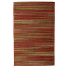 Marina Stripes Red area rug, a versatile piece that complements any decor style with its thin stripe pattern in red, blue, and yellow hues. Perfect for both indoor and outdoor spaces, this rug is crafted in Egypt from 100% polypropylene for durability. The Marina Collection features intricate designs and a wide color spectrum, all power-loomed for a high-quality finish.