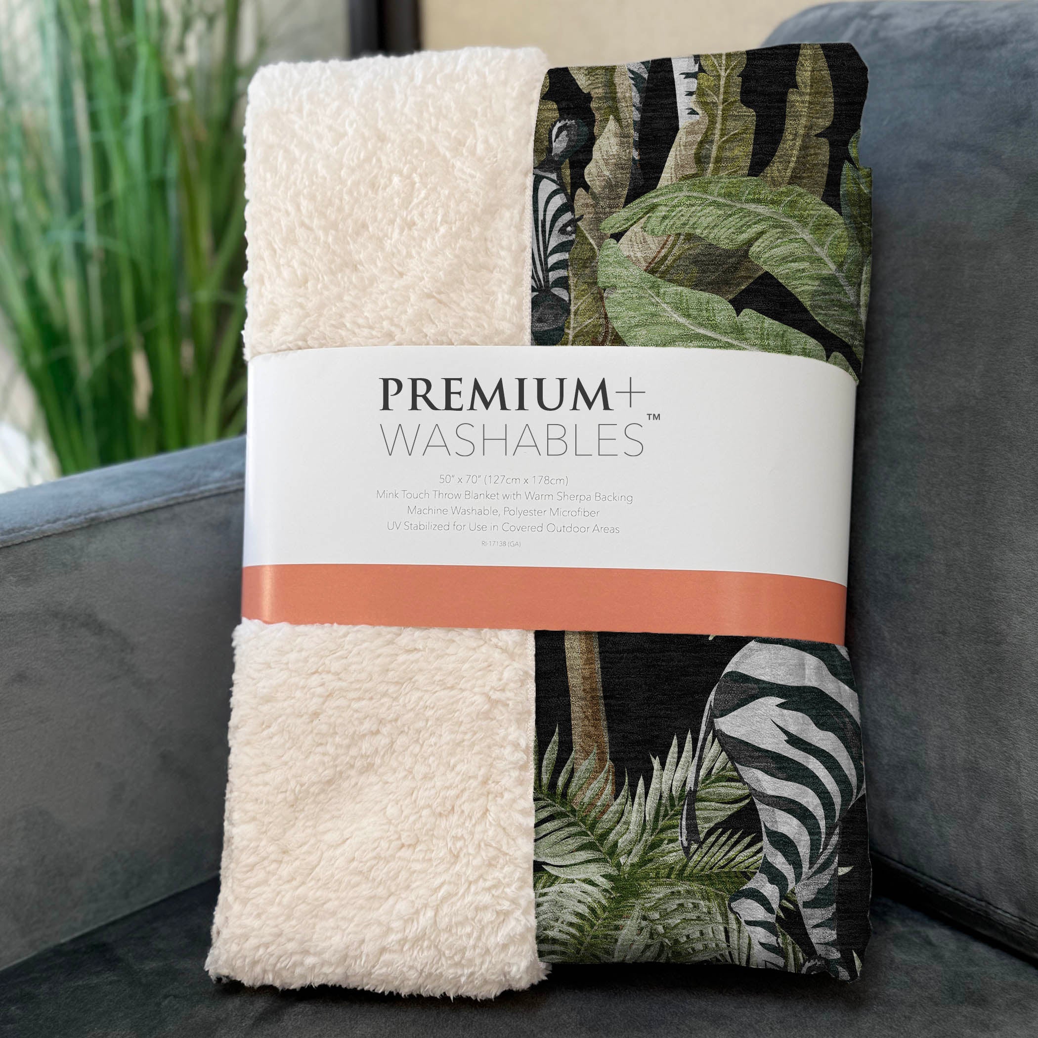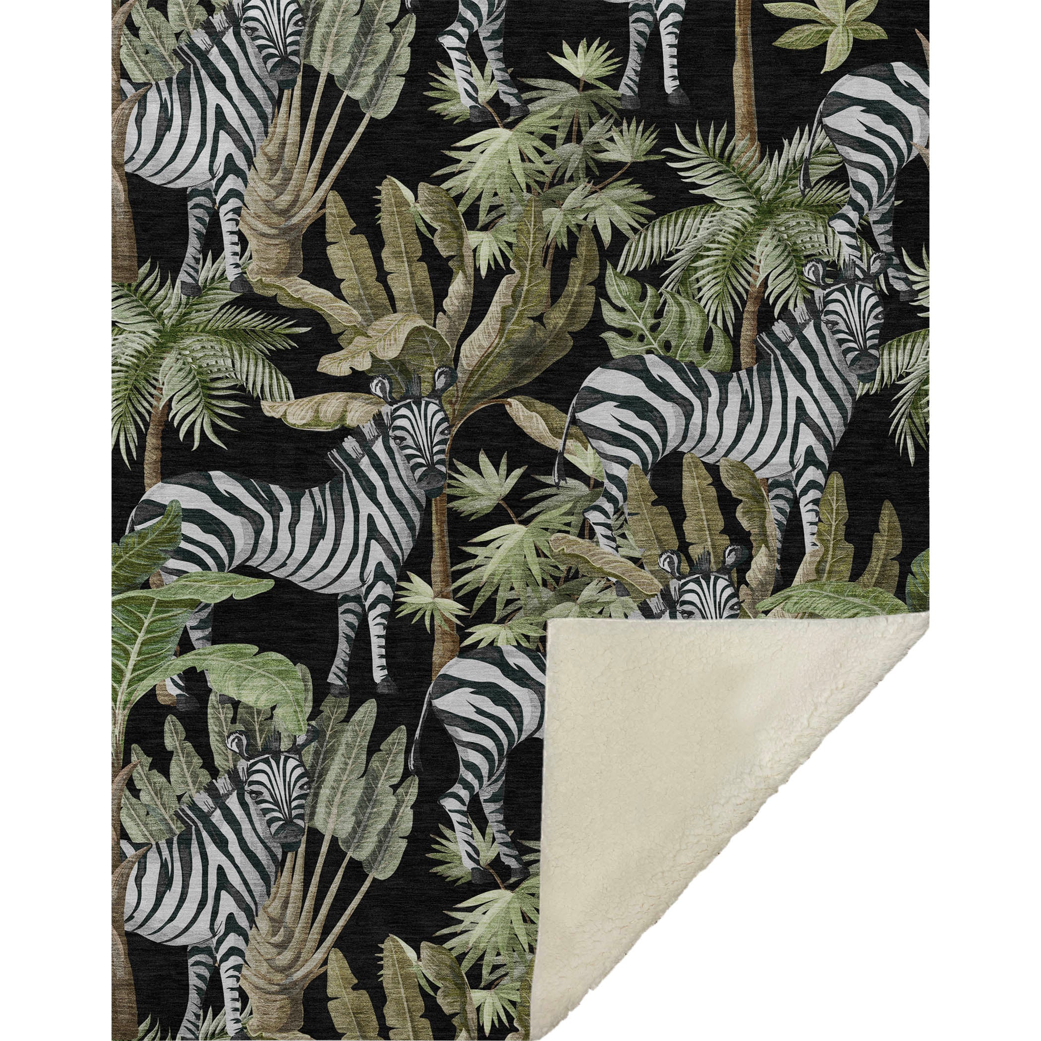 Dive into a world where exotic zebras meet lush palm leaves, creating a tropical paradise right in your home! This captivating design draws the eye with its engaging pattern, perfectly complemented by an oversized 50" x 70" dimension for generous comfort. Experience the ultimate blend of luxurious soft-touch front and cozy sherpa backing, all crafted from fade-resistant polyester microfiber ideal for both indoor and covered outdoor spaces, plus it's effortlessly maintained as a machine-washable delight.