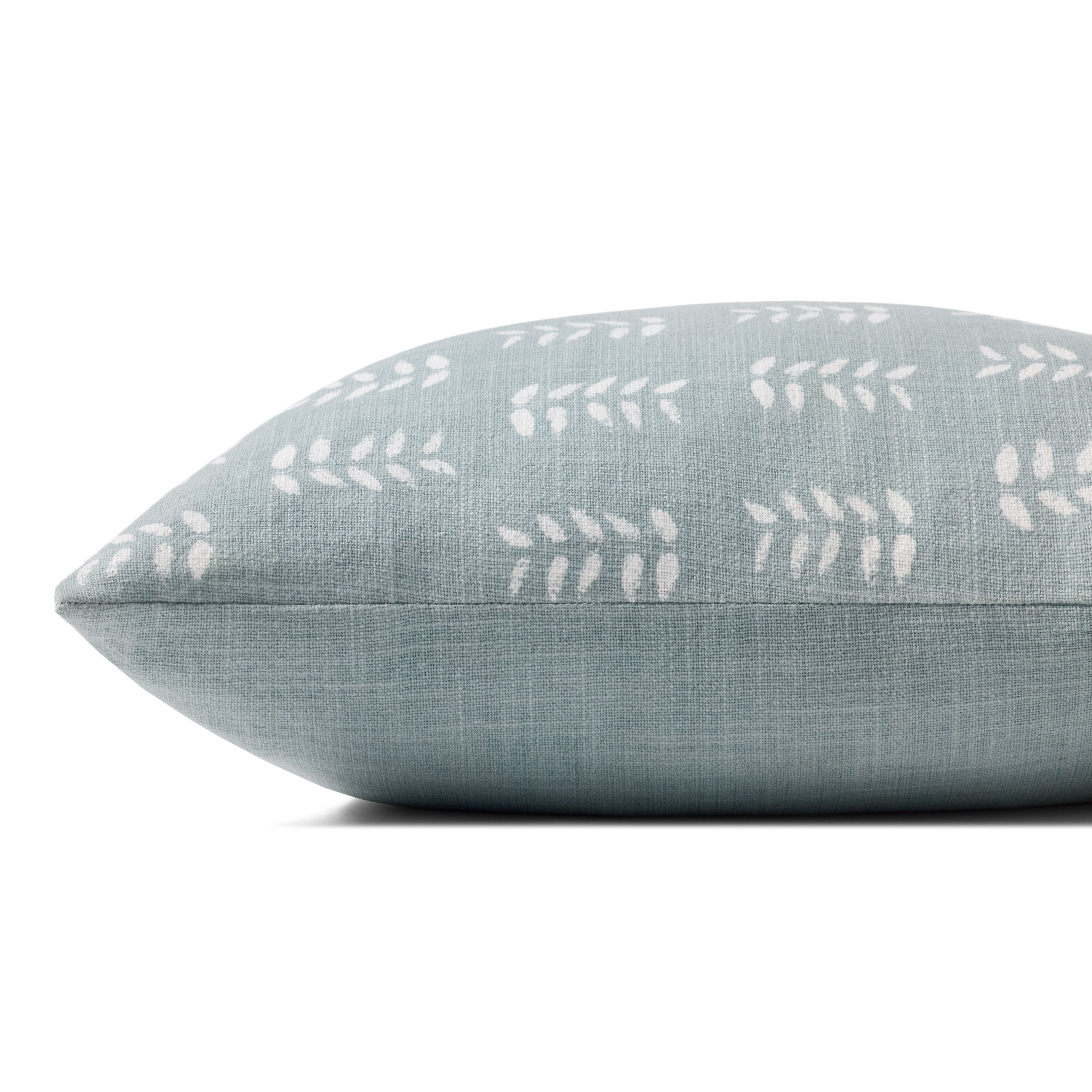 Tully is a blue-grey and white throw pillow from Chris Loves Julia x Loloi with a block print-inspired leaf pattern. The pillow cover is made of 100% cotton and measures 18” x 18”, the perfect size to style in living rooms and bedrooms.