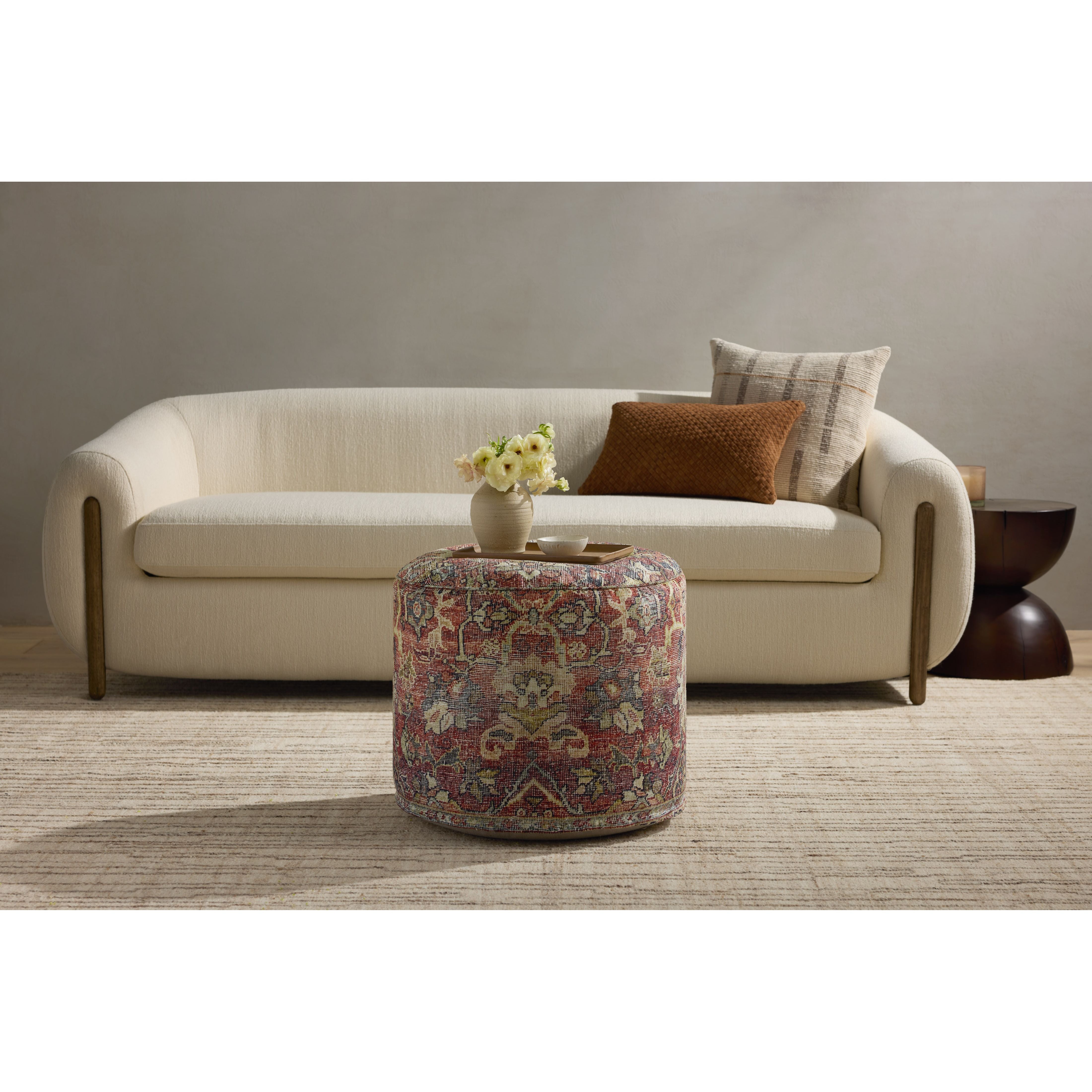 This spice red-toned pouf with a traditional, vintage-inspired design can be used as an accent, an ottoman, or extra seating in your living room or bedroom. The pouf measures 18"W x 18"D x 20"H and is machine-woven in China of easy-to-clean polyester.