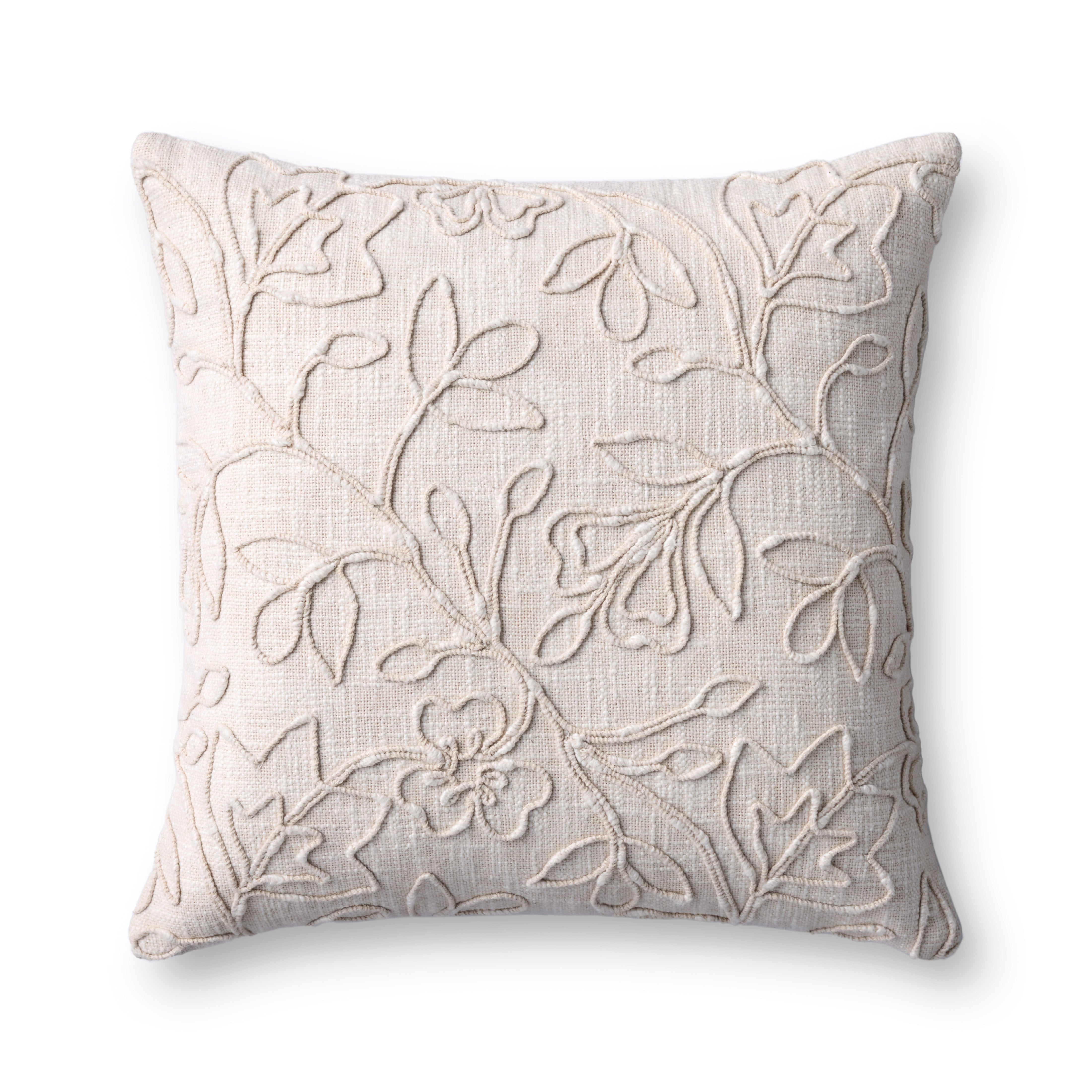 This natural ivory throw pillow features elegant embroidered botanicals in the same tone. The pillow cover is made of 100% cotton to style in living rooms and bedrooms.
