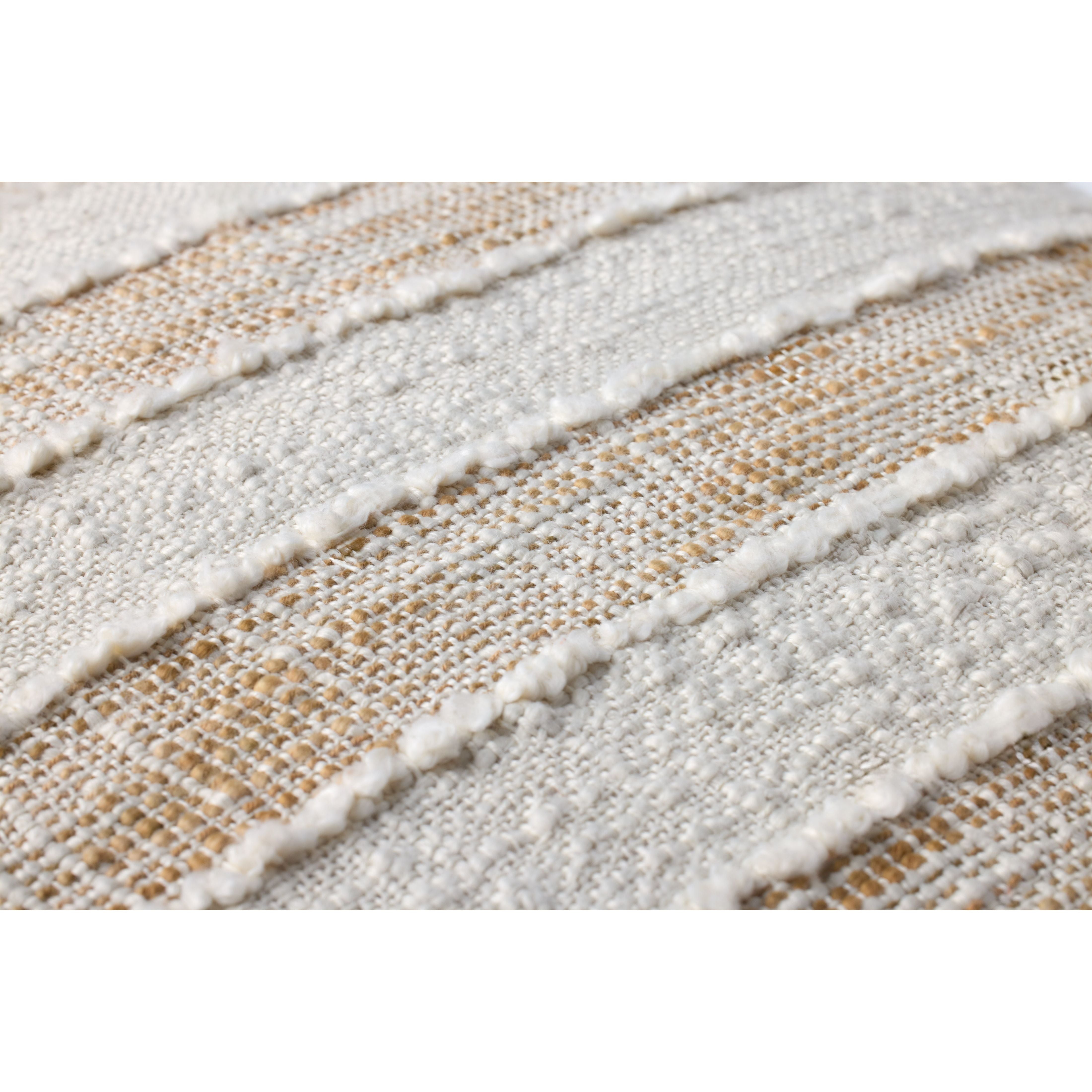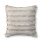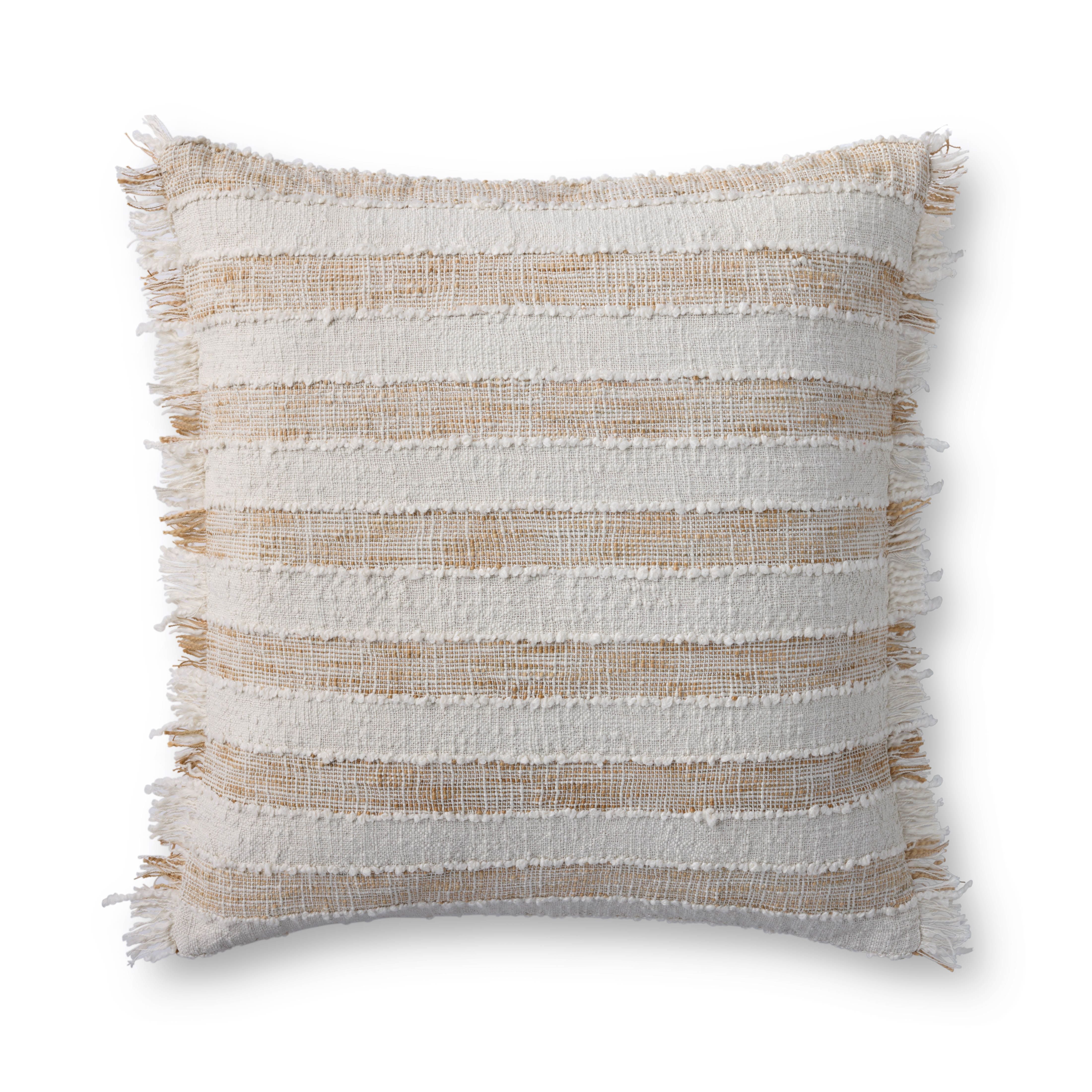 This woven throw pillow features heathered beige and ivory stripes with fringed edges and raised stitch detailing. The pillow cover is made of cotton and polyester and measures 22” x 22”, a standard size to style in living rooms and bedrooms.