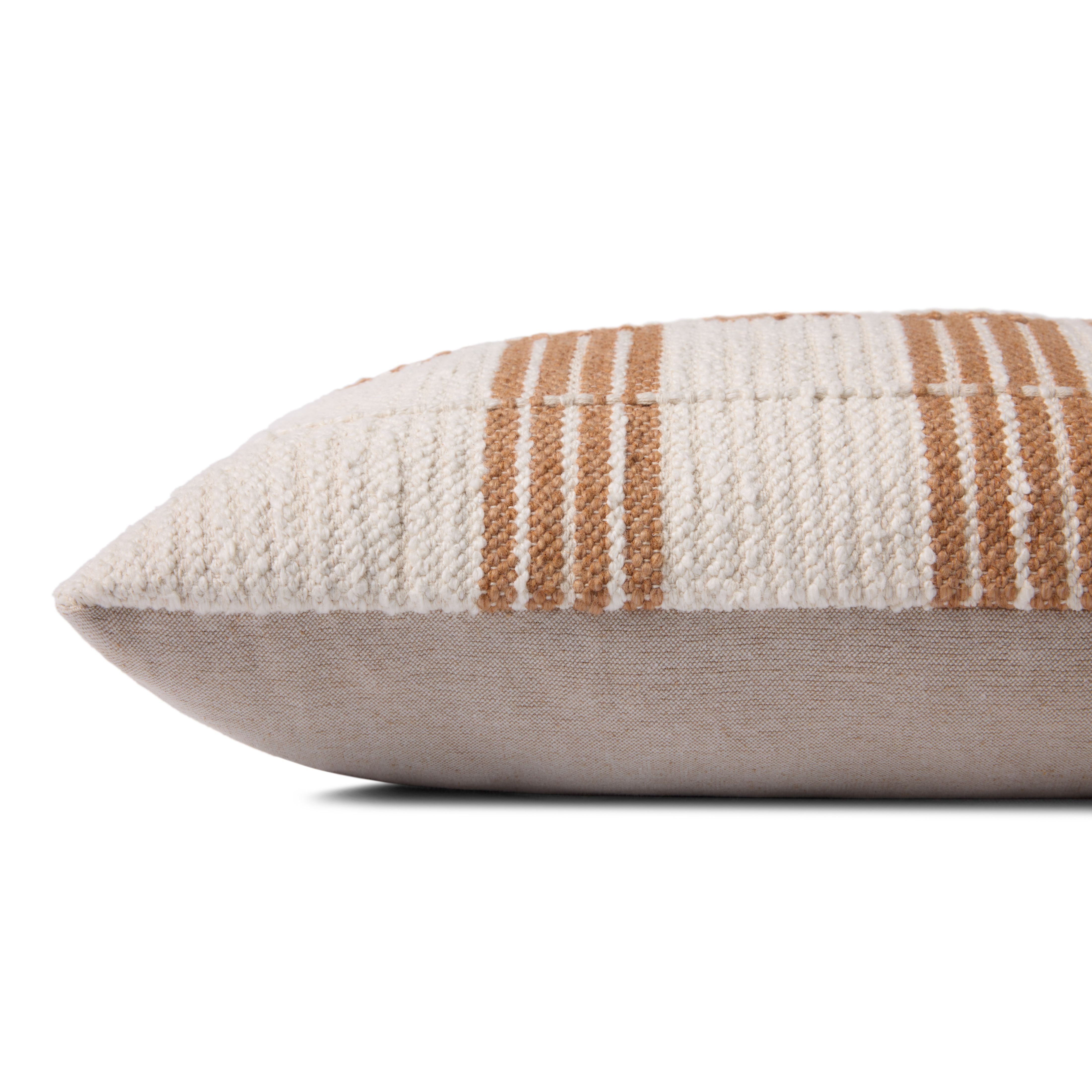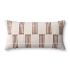 This woven throw pillow features a muted rust and ivory broken stripe pattern with raised stitched detailing. The pillow cover is made of cotton and polyester and measures 12” x 27”, an elongated size to style in living rooms and bedrooms.