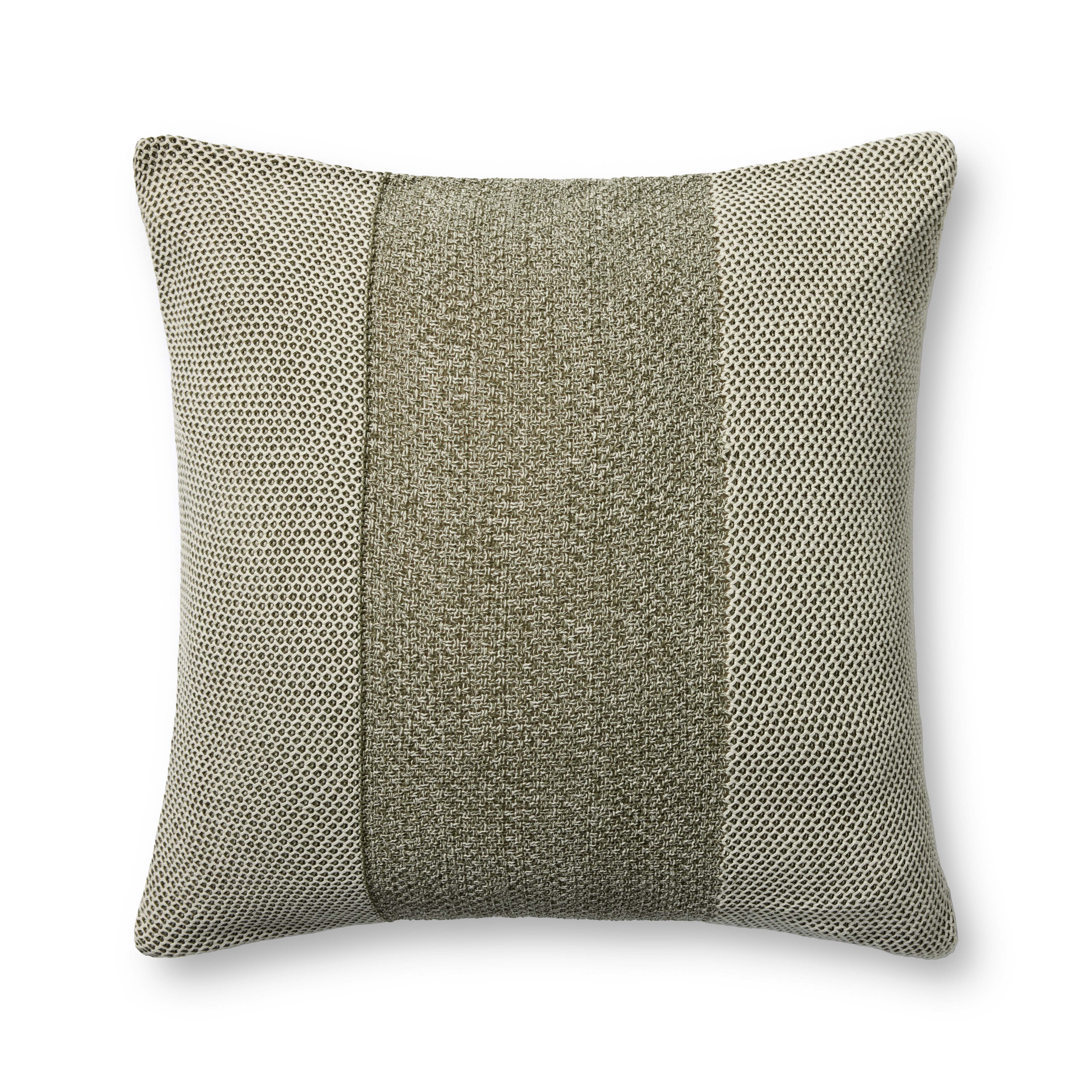 This neutral green throw pillow has a soft woven texture and a darker-toned center stripe, a classic design for nearly all home decor styles. The 22” x 22” square pillow is machine-woven in India of 100% cotton.