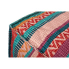 This large pouf or floor cushion features a striped pattern inspired by South American textiles, a playful accent piece for colorful home decor. The cushion measures 24”W x 24”D x 13”H and is made of polyester in China.