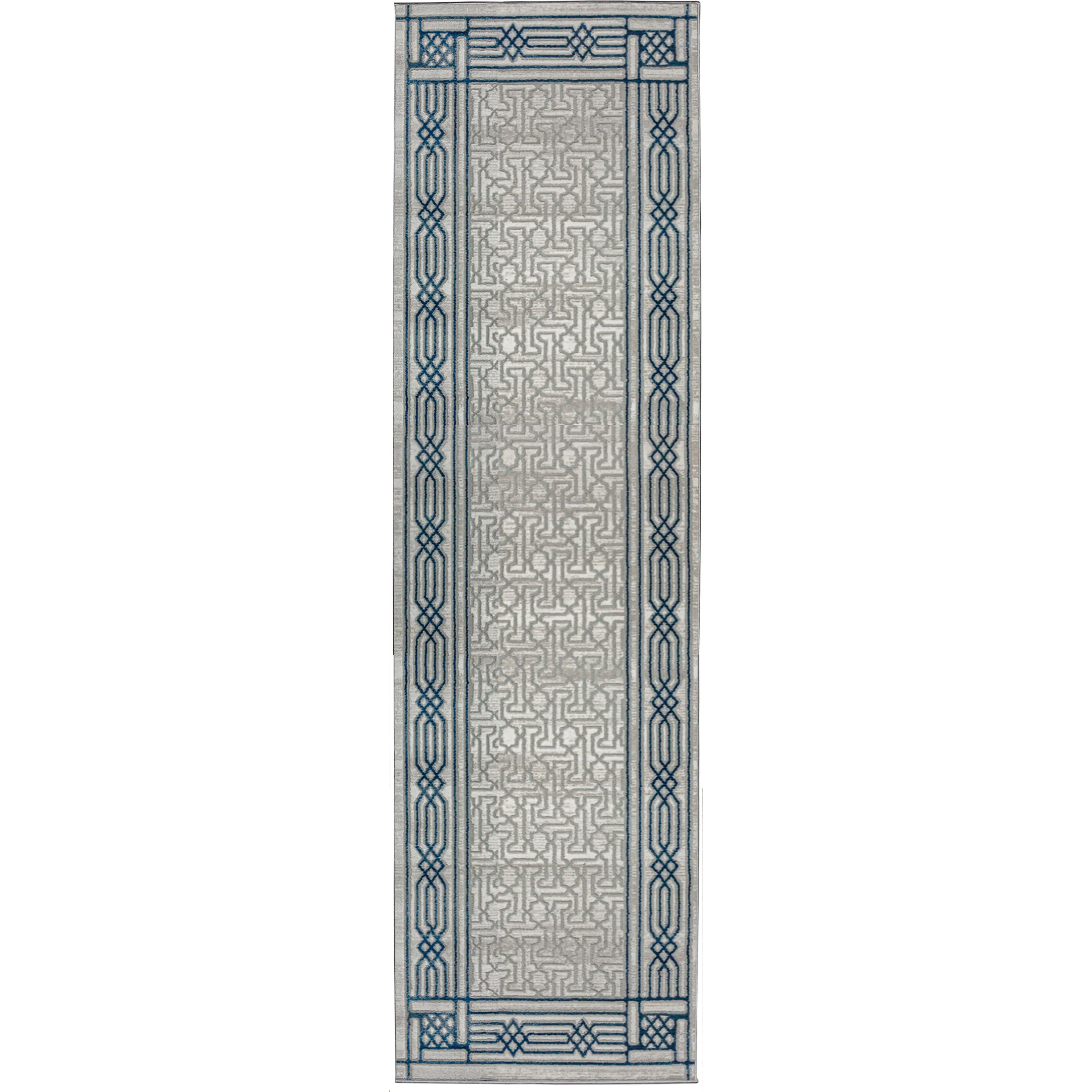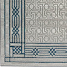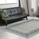 Davide 1231 Blue area rug, a sculpted design crafted with soft-touch polypropylene and shrink polyester. This exquisite rug is perfect for those seeking to add a touch of elegance to their home decor. The bordered, machine-made design features a blend of green and neutral hues that effortlessly complement both classic and modern styles.