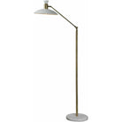 The artful proportions of this decorative floor lamp play with the contrast of angles and curves. The slanted silhouette of the matte white metal shade is delicately balanced by a metal stem and round white marble base. Finished in polished brass for a hint of modern glamour, the jointed metal stem can pivot the lampshade toward areas that require additional illumination.